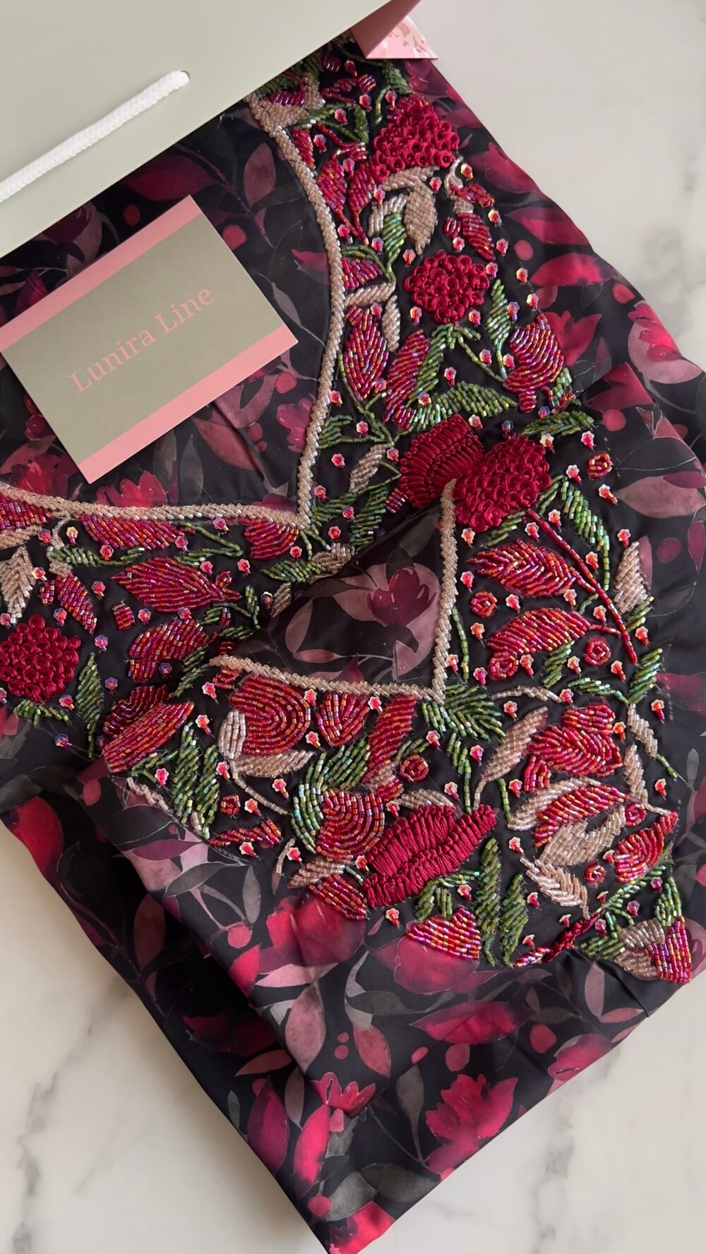 The fabric is Italian silk . The embroidery is hand-beaded with pearls, sequins, and nylon threads with high precision. Fabric length: 3.5 yards, with a double width. Neckline measurement: 7.5 inches in length and 7 inches in width.