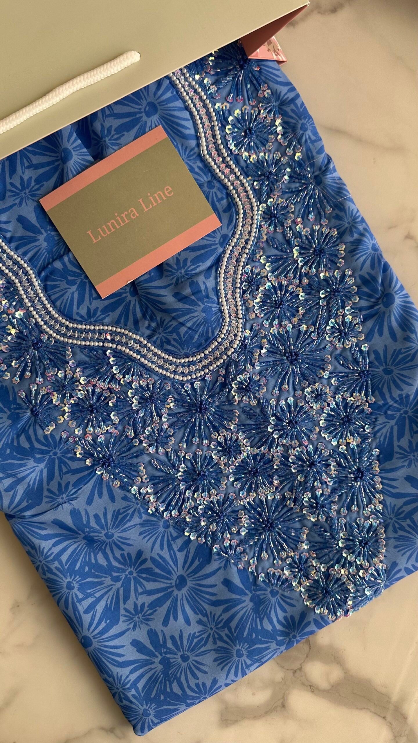 The fabric is Liberty cotton. The embroidery is hand-beaded with pearls, sequins, and nylon threads with high precision. Fabric length: 4 yards. Neckline measurement: 7.5inches in length and 7inches in width.
