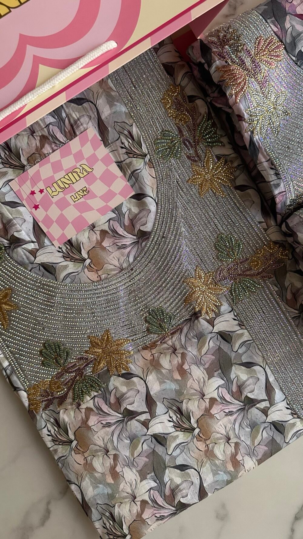 The fabric is liberty cotton. The embroidery is hand-beaded with pearls, sequins, and nylon threads with high precision. Fabric length: 4 yards. Neckline measurement: 8 inches in length and 7 inches in width.