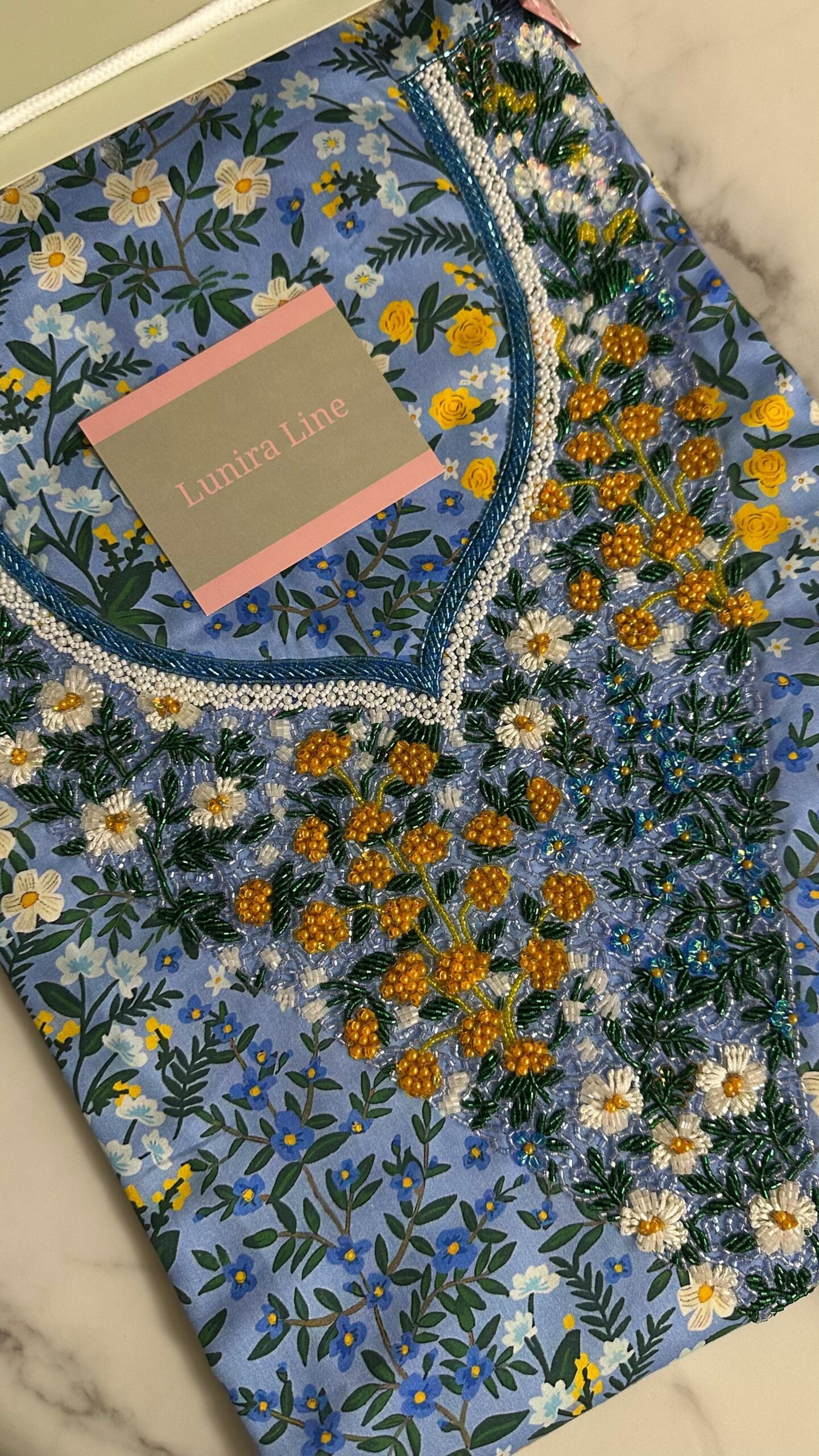 The fabric is liberty cotton. The embroidery is hand-beaded with pearls, sequins, and nylon threads with high precision. Fabric length: 4 yards. Neckline measurement: 8 inches in length and 7 inches in width.