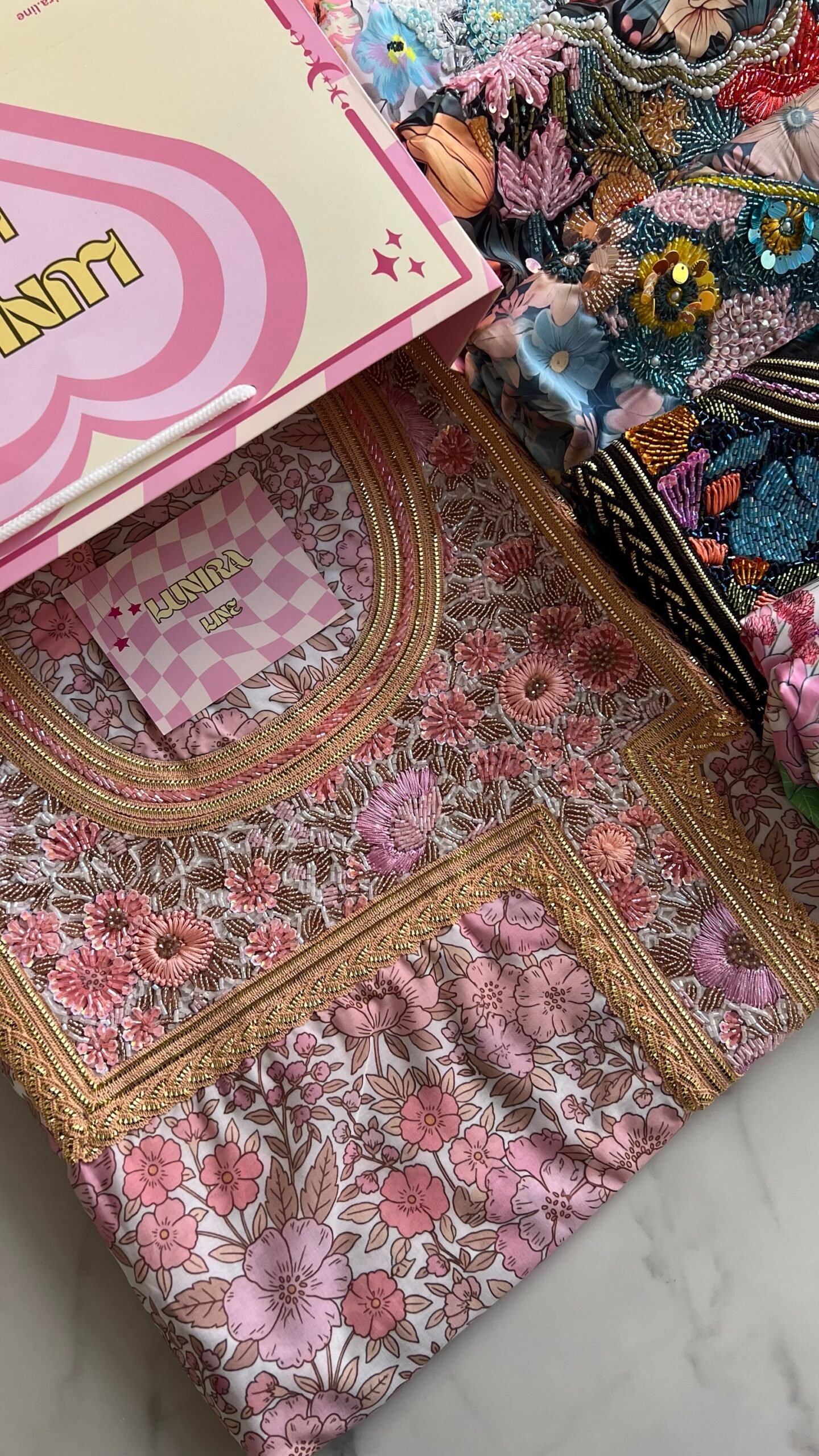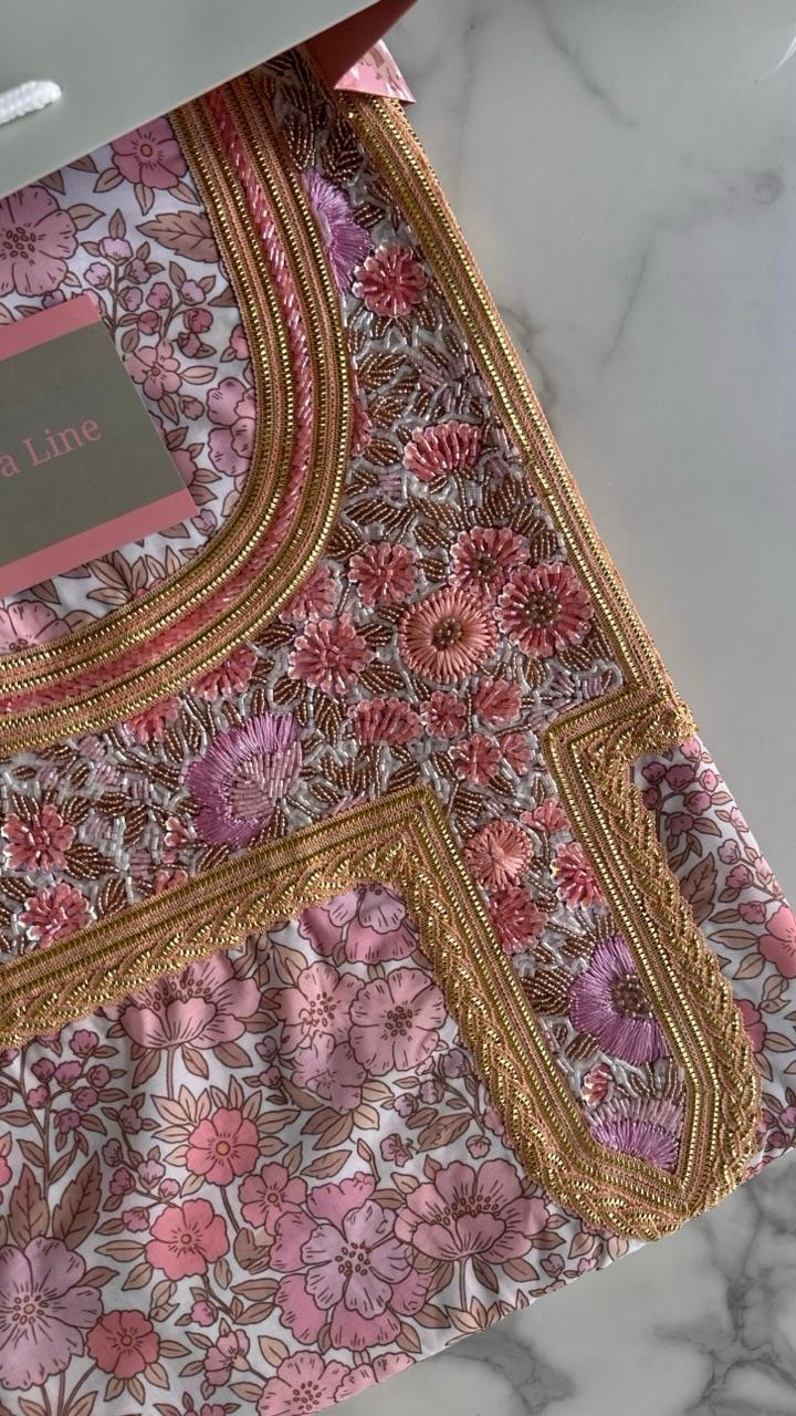 The fabric is liberty cotton. The embroidery is hand-beaded with pearls, sequins, and nylon threads with high precision. Fabric length: 4 yards. Neckline measurement: 8 inches in length and 7 inches in width.