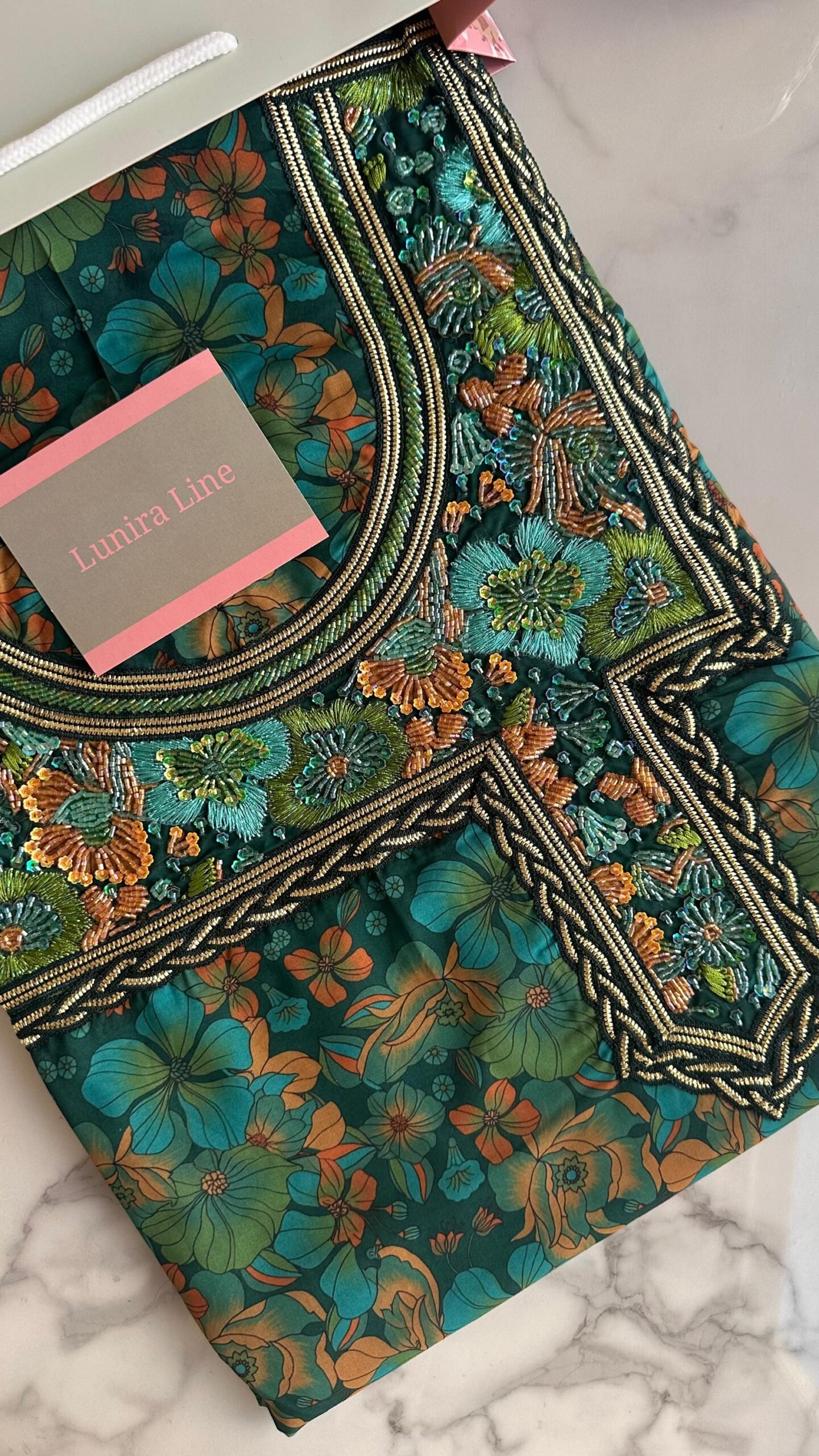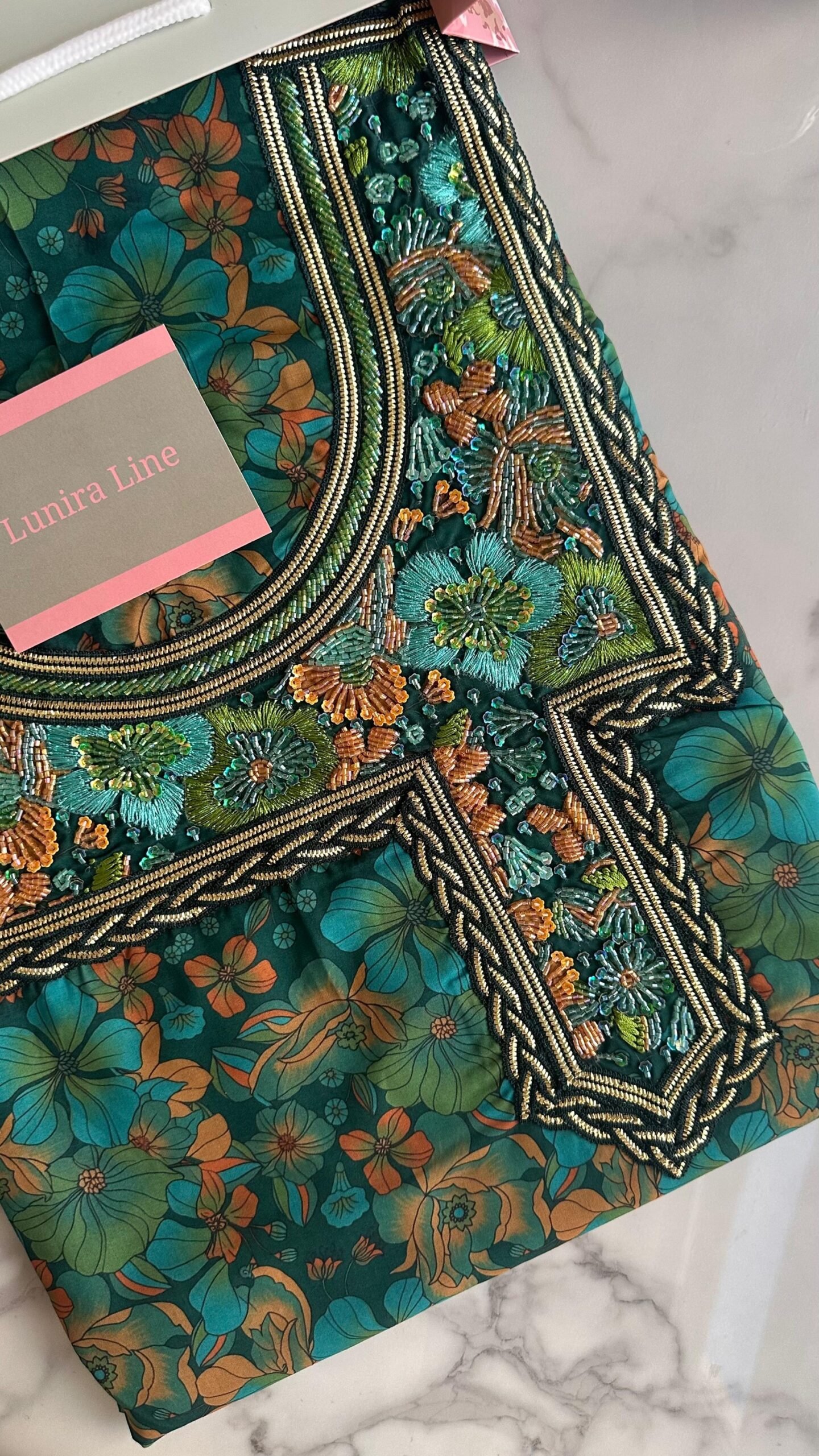 The fabric is liberty cotton. The embroidery is hand-beaded with pearls, sequins, and nylon threads with high precision. Fabric length: 4 yards. Neckline measurement: 8 inches in length and 7 inches in width.