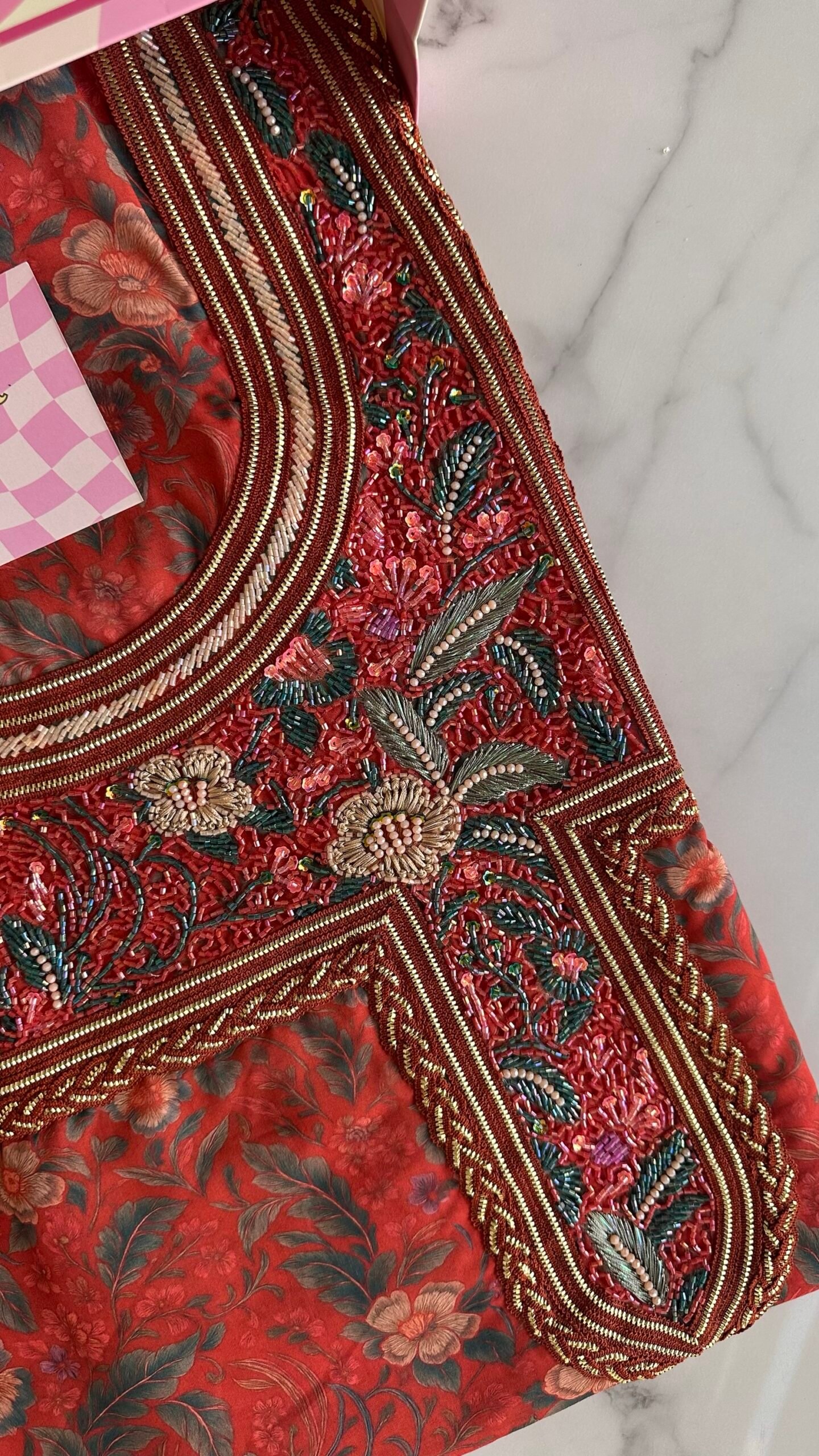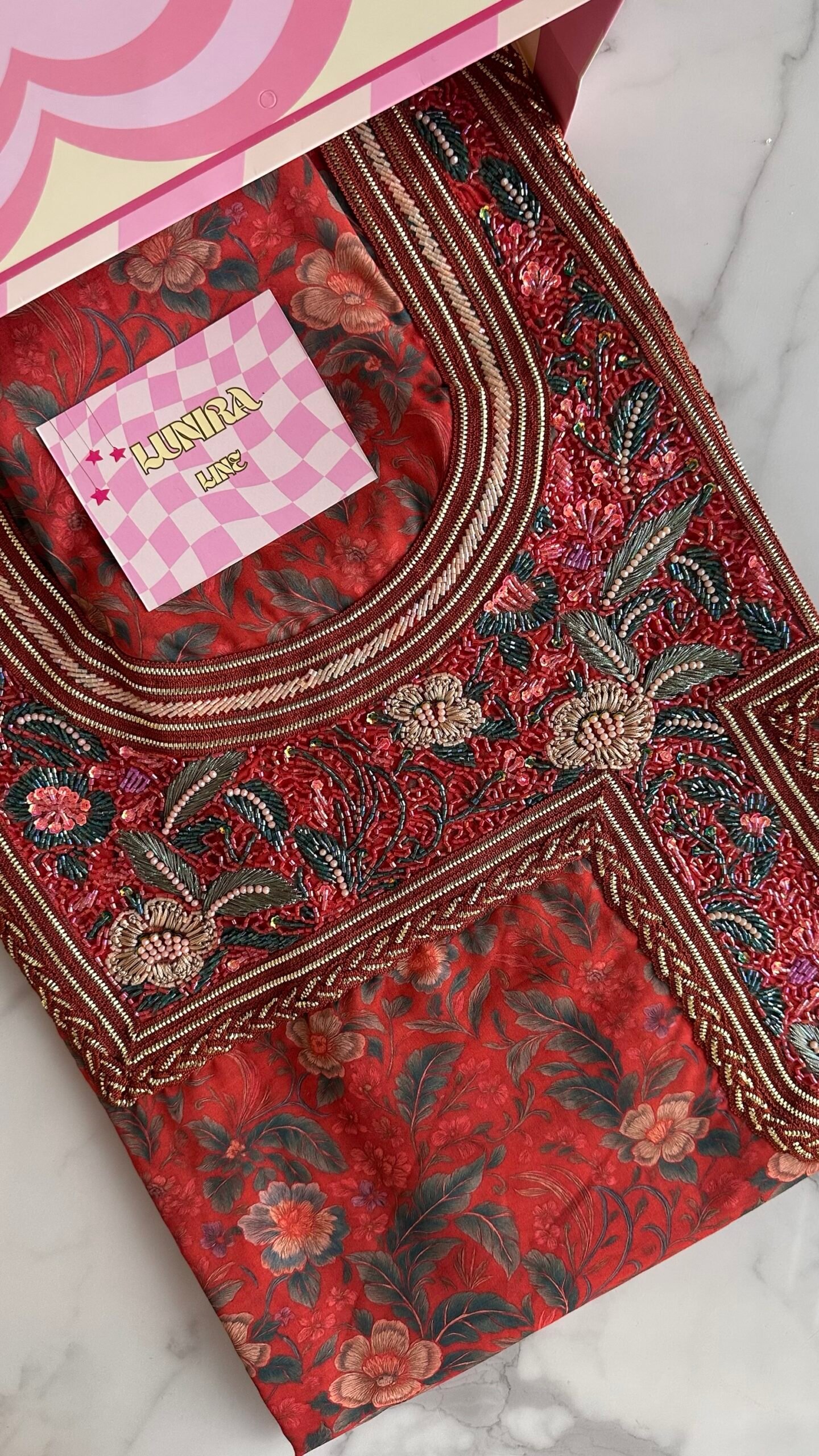 The fabric is cotton. The embroidery is hand-beaded with pearls, sequins, and nylon threads with high precision. Fabric length: 4 yards. Neckline measurement: 8 inches in length and 7 inches in width.