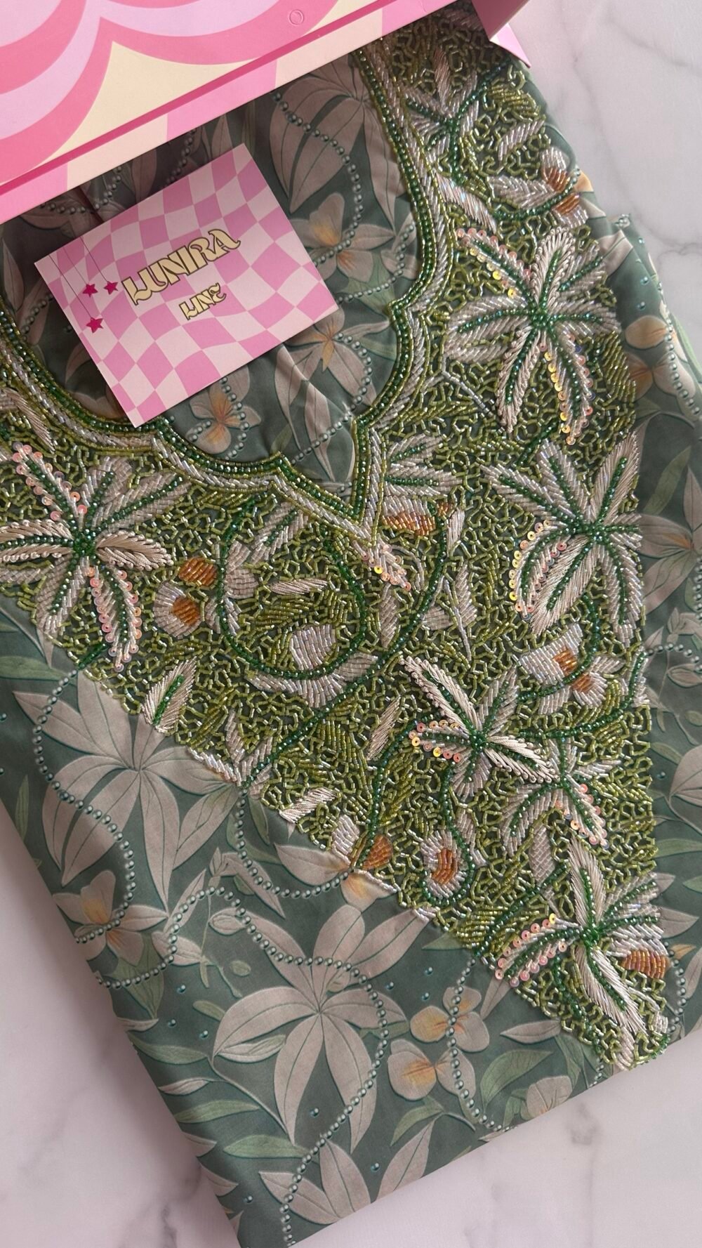 The fabric is cotton. The embroidery is hand-beaded with pearls, sequins, and nylon threads with high precision. Fabric length: 4 yards. Neckline measurement: 8 inches in length and 7 inches in width.
