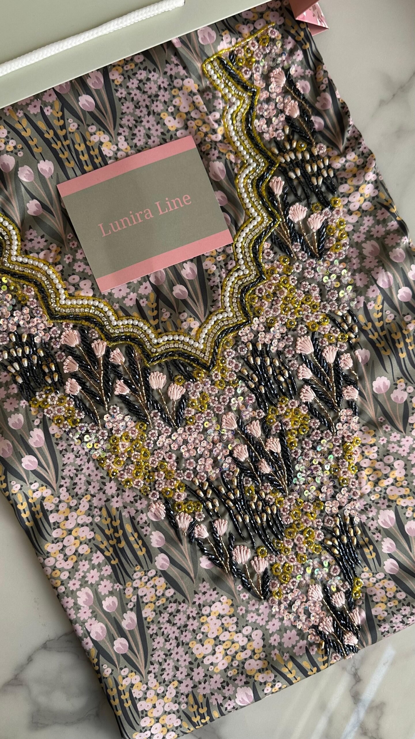 The fabric is Italian silk . The embroidery is hand-beaded with pearls, sequins, and nylon threads with high precision. Fabric length: 3.5 yards, with a double width. Neckline measurement: 7.5 inches in length and 6.5 inches in width.