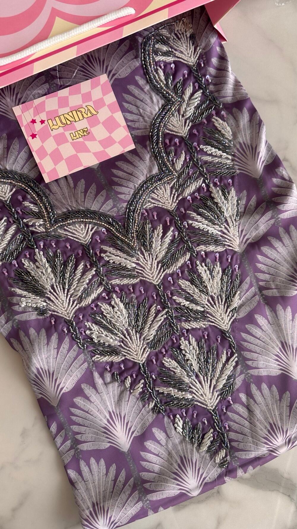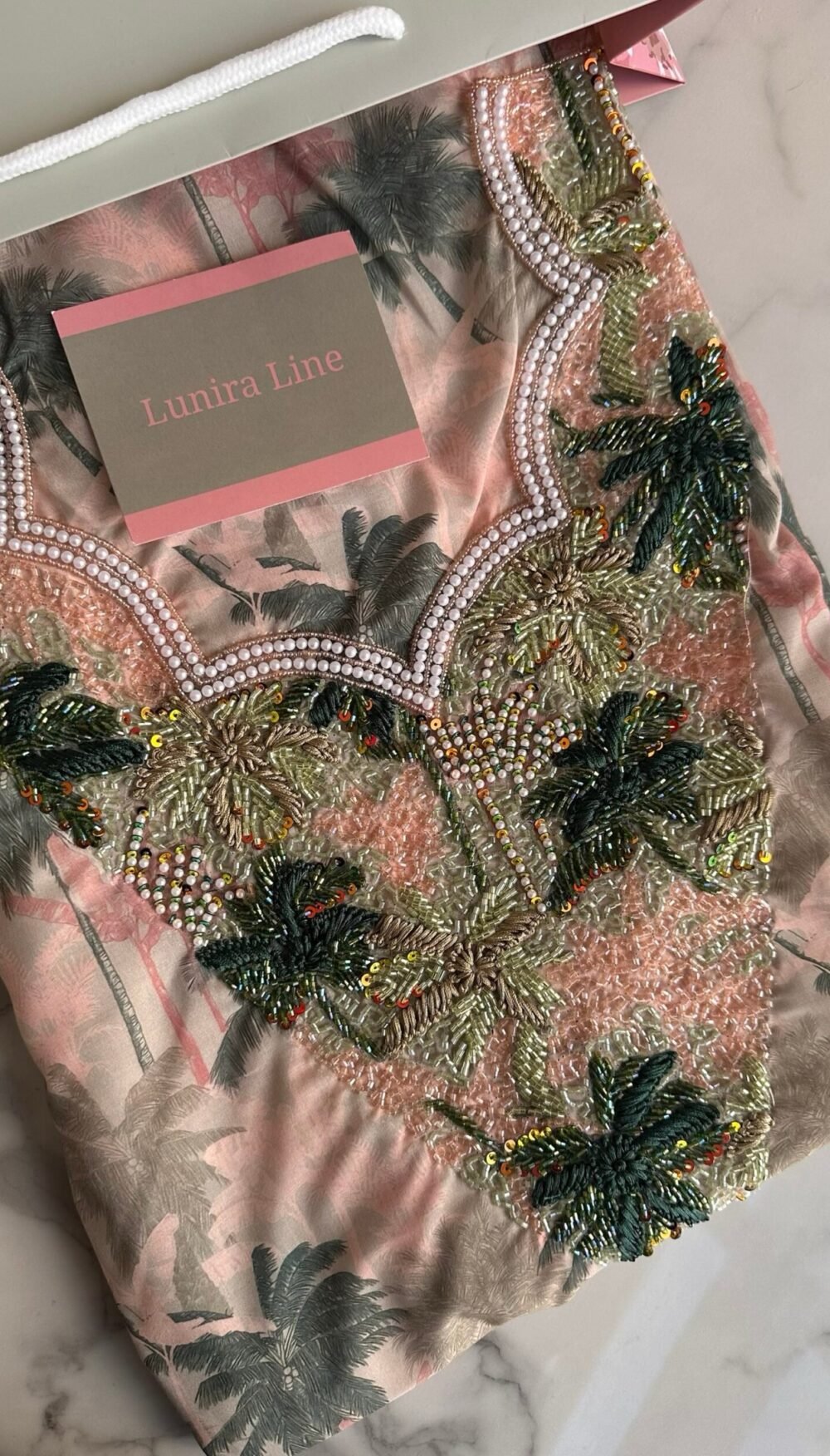 The fabric is Italian silk . The embroidery is hand-beaded with pearls, sequins, and nylon threads with high precision. Fabric length: 3.5 yards, with a double width. Neckline measurement: 8 inches in length and 7.5 inches in width.