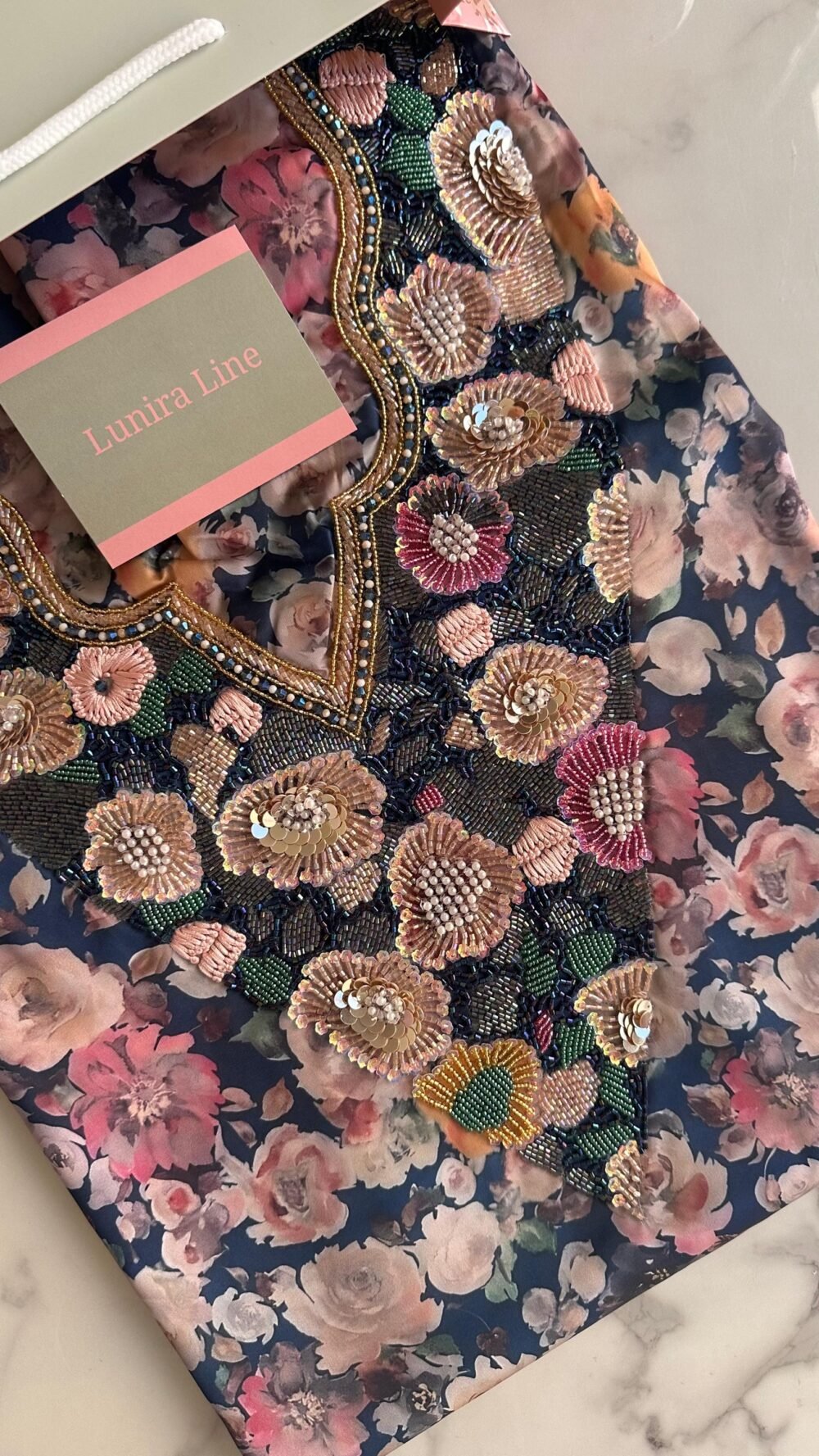 The fabric is Italian silk . The embroidery is hand-beaded with pearls, sequins, and nylon threads with high precision. Fabric length: 3.5 yards, with a double width. Neckline measurement: 7.5 inches in length and 7 inches in width.