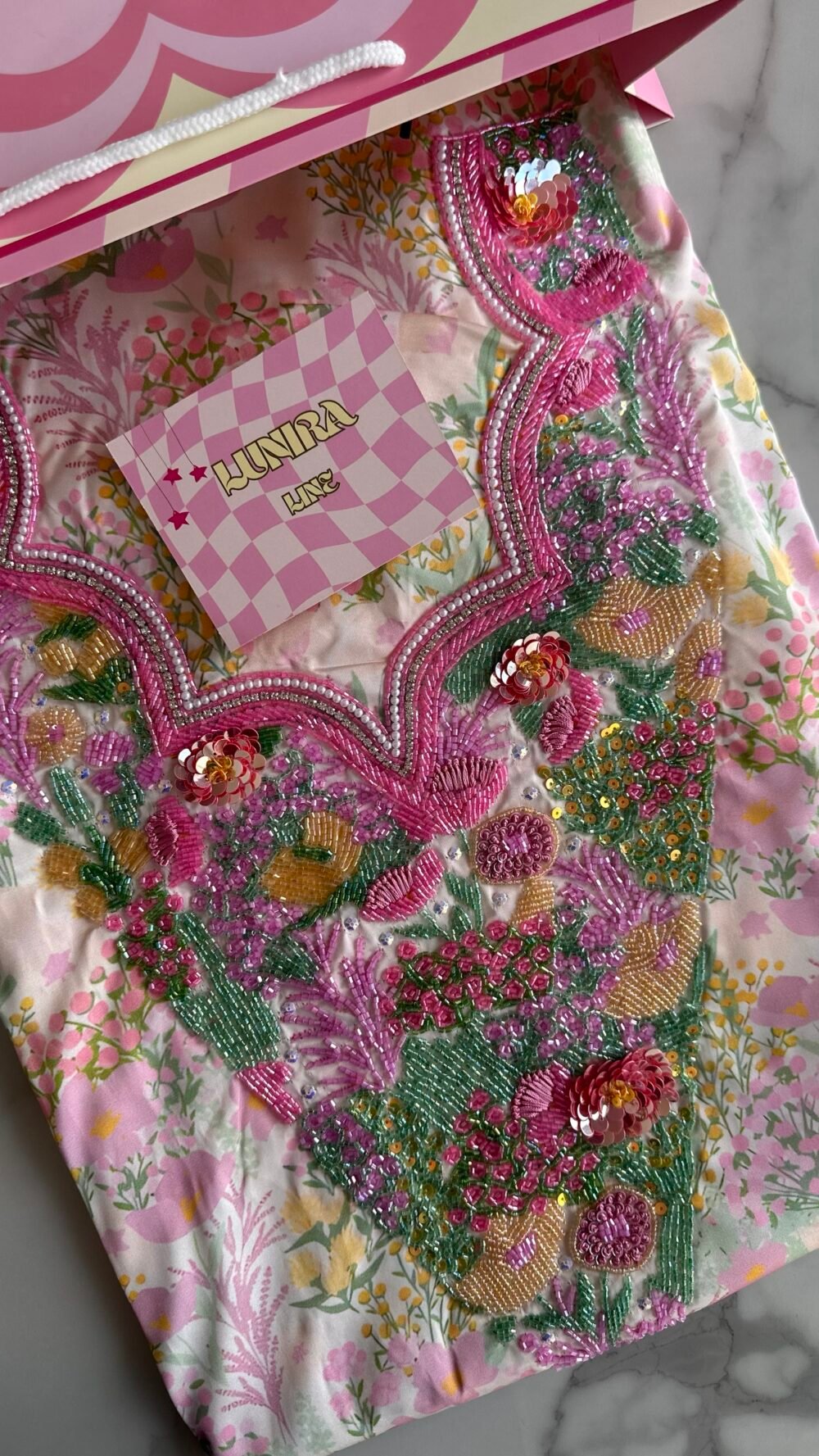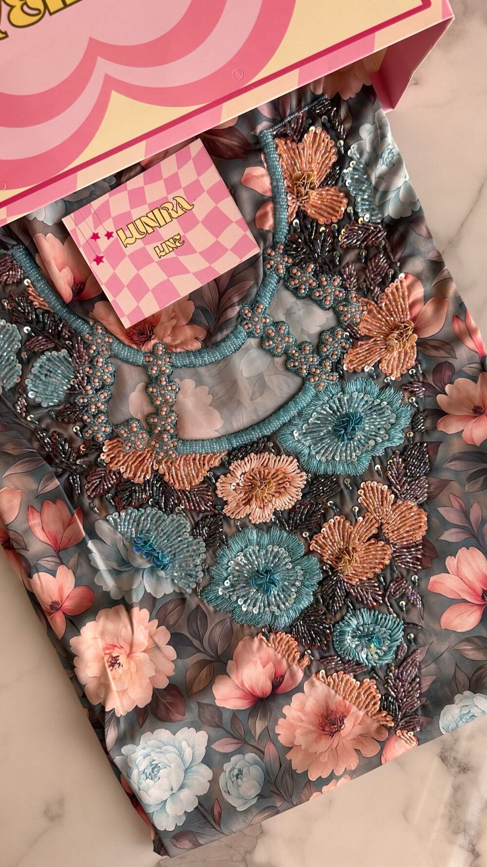 Hand wash or steam only to preserve the quality of the beading.