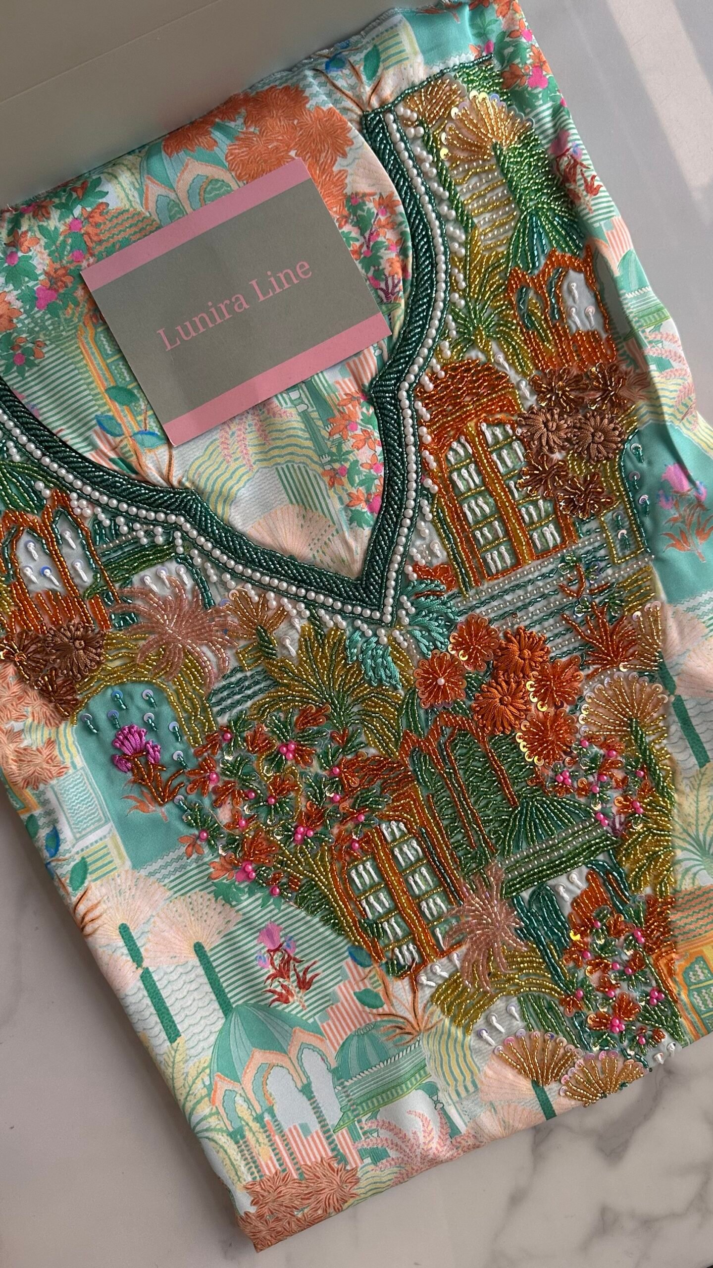 The fabric is Italian silk . The embroidery is hand-beaded with pearls, sequins, and nylon threads with high precision. Fabric length: 3.5 yards, with a double width. Neckline measurement: 7.5 inches in length and 7 inches in width.