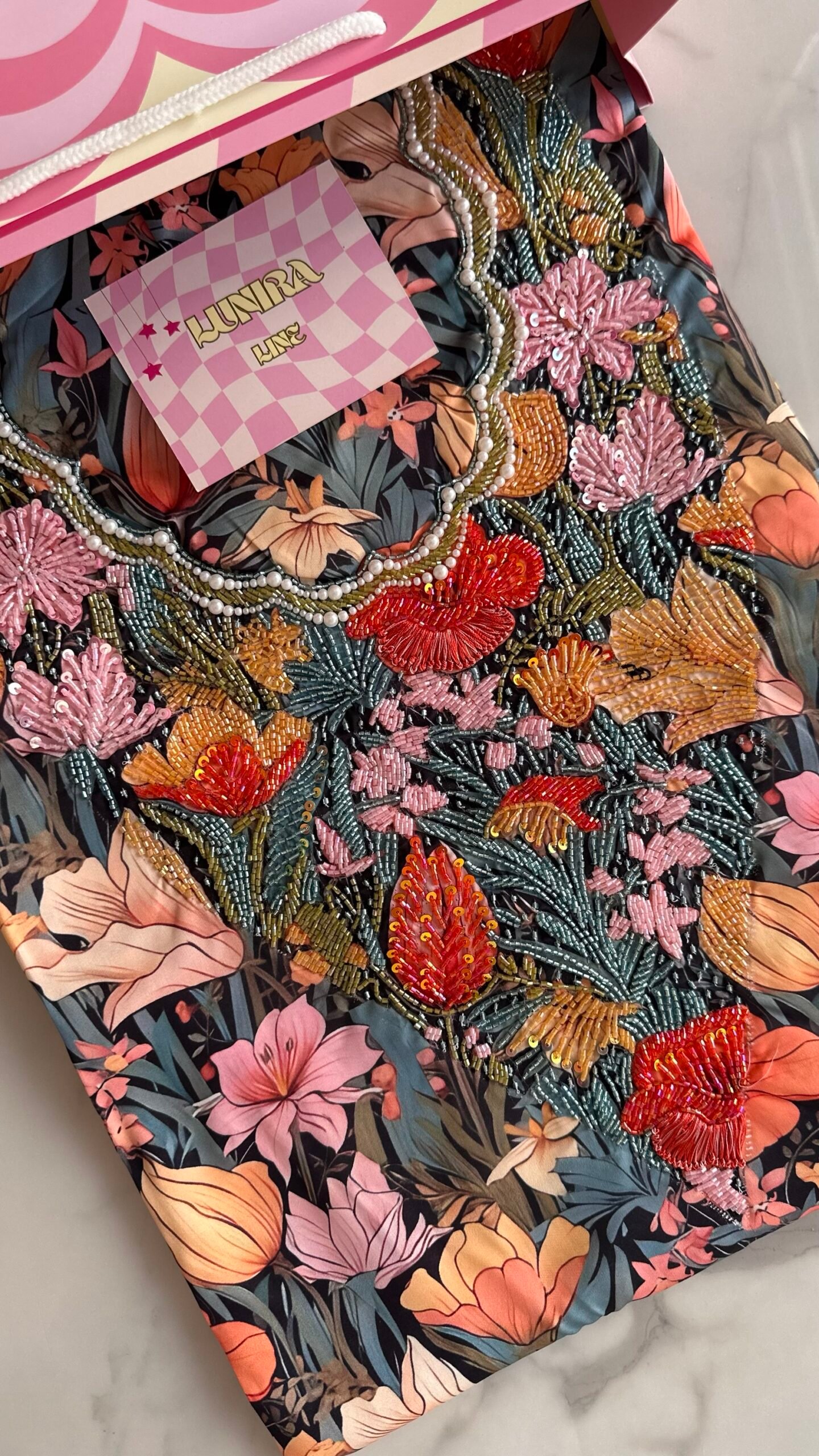 The fabric is Italian silk . The embroidery is hand-beaded with pearls, sequins, and nylon threads with high precision. Fabric length: 3.5 yards, with a double width. Neckline measurement: 7 inches in length and 7.5inches in width.