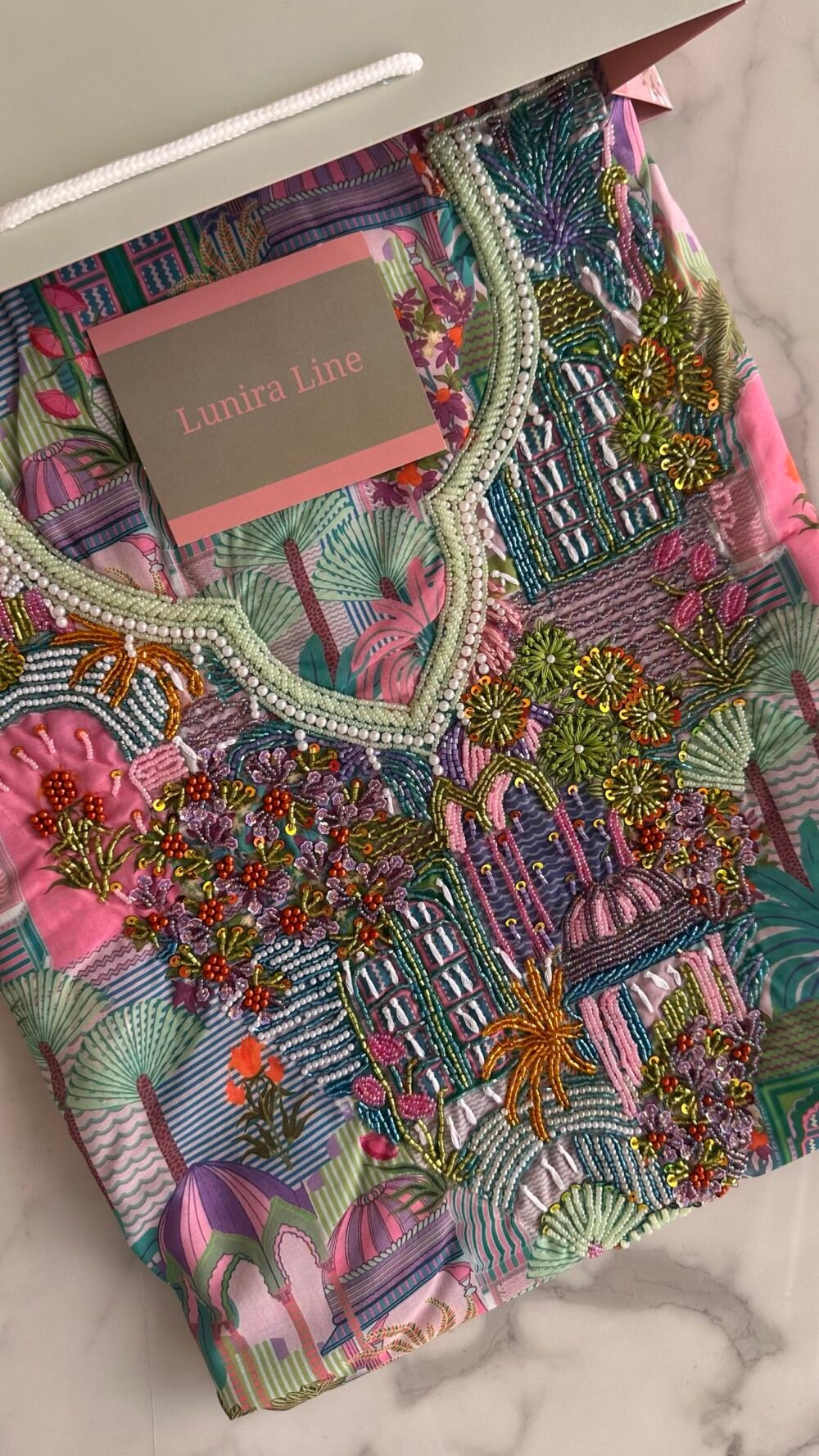 The fabric is Italian silk . The embroidery is hand-beaded with pearls, sequins, and nylon threads with high precision. Fabric length: 3.5 yards, with a double width. Neckline measurement: 8 inches in length and 7.5 inches in width.