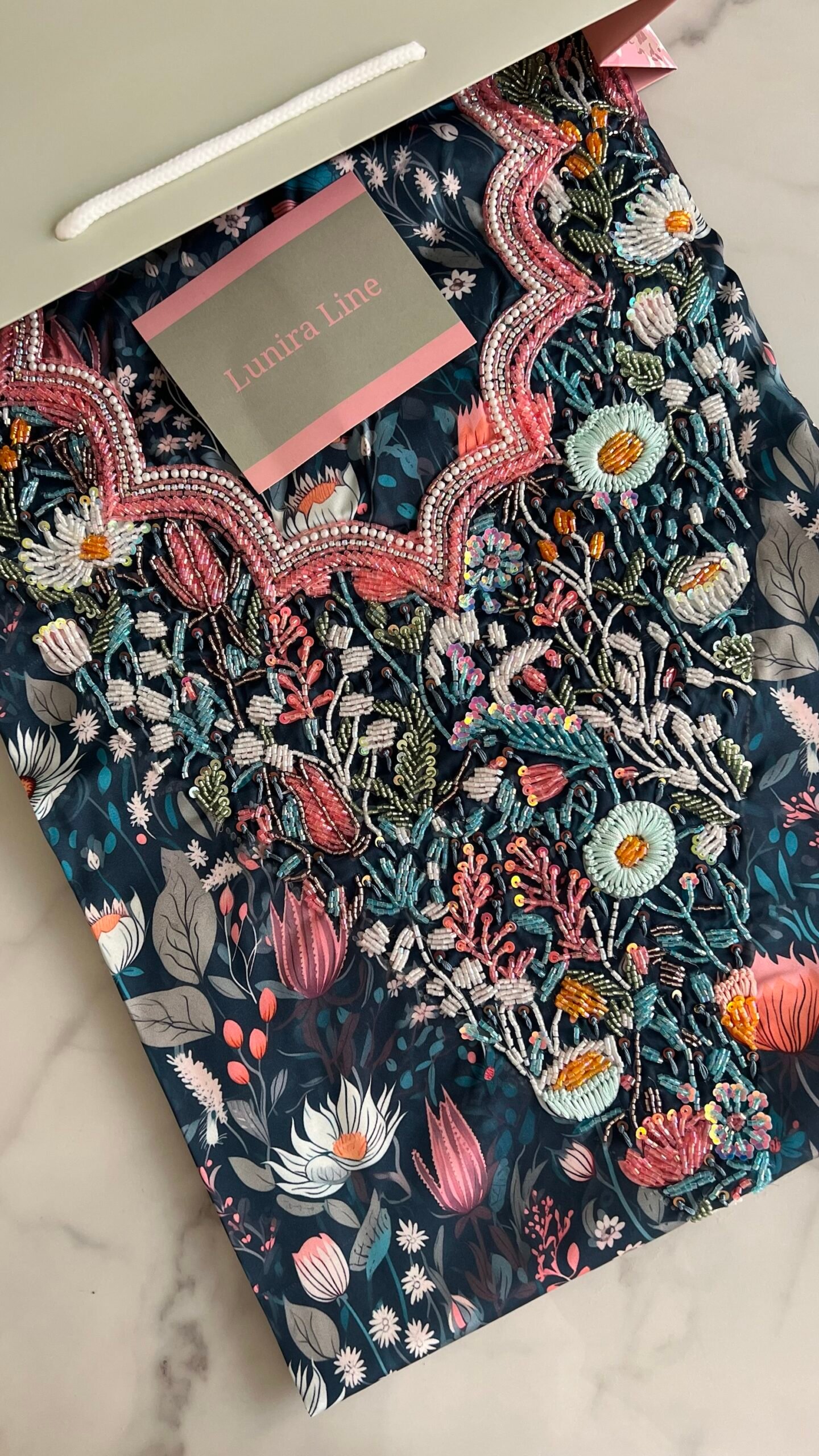 The fabric is Italian silk . The embroidery is hand-beaded with pearls, sequins, and nylon threads with high precision. Fabric length: 3.5 yards, with a double width. Neckline measurement: 8 inches in length and 7.5 inches in width.