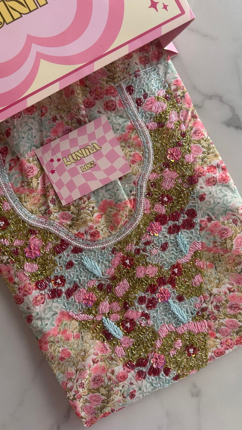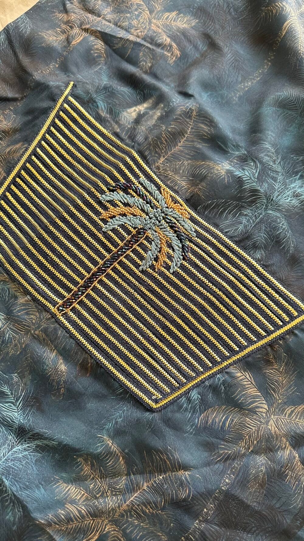 The fabric is cotton. The embroidery is hand-beaded with pearls, sequins, and nylon threads with high precision. Fabric length: 4 yards. Neckline measurement: 8 inches in length and 7 inches in width.