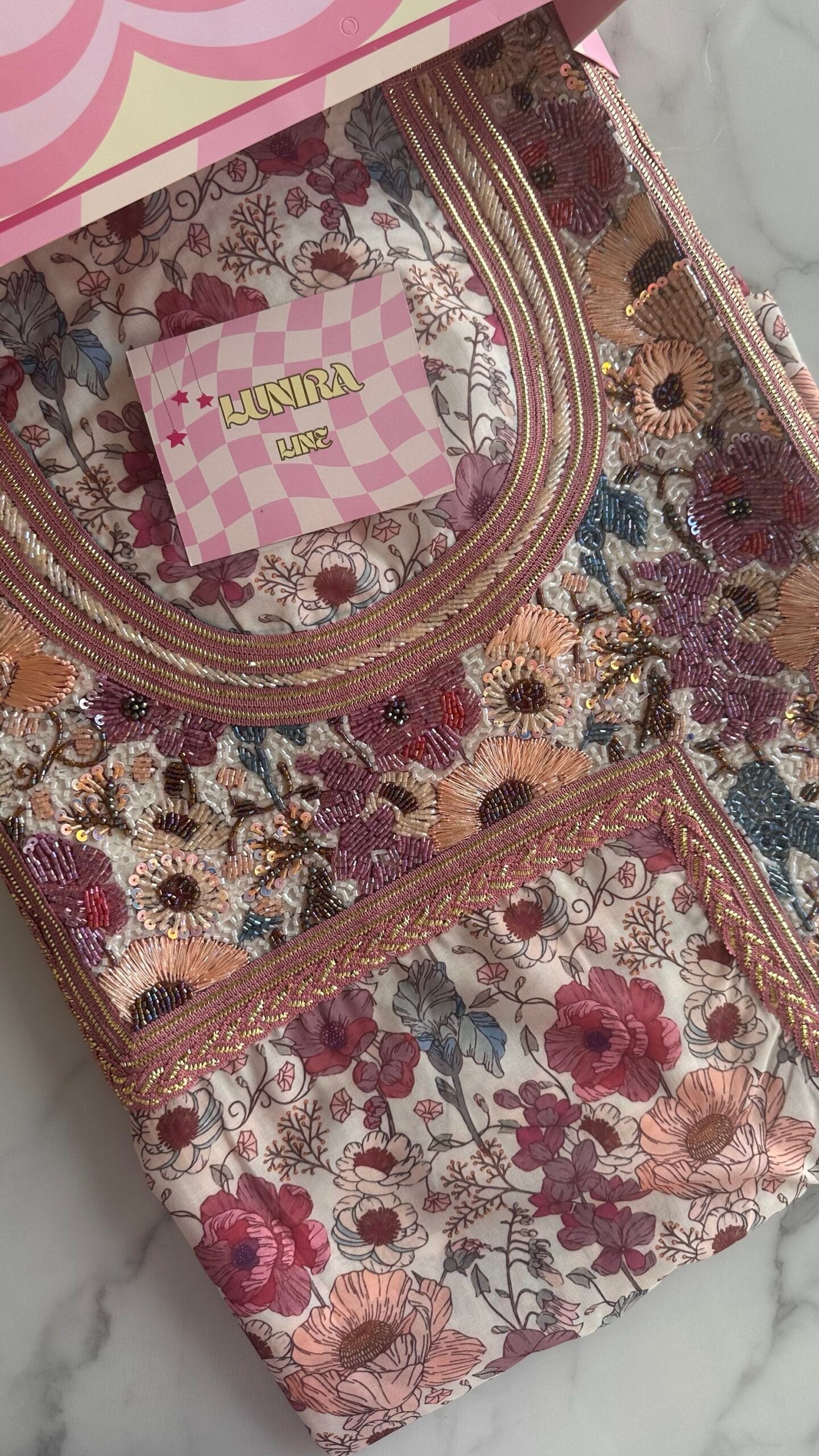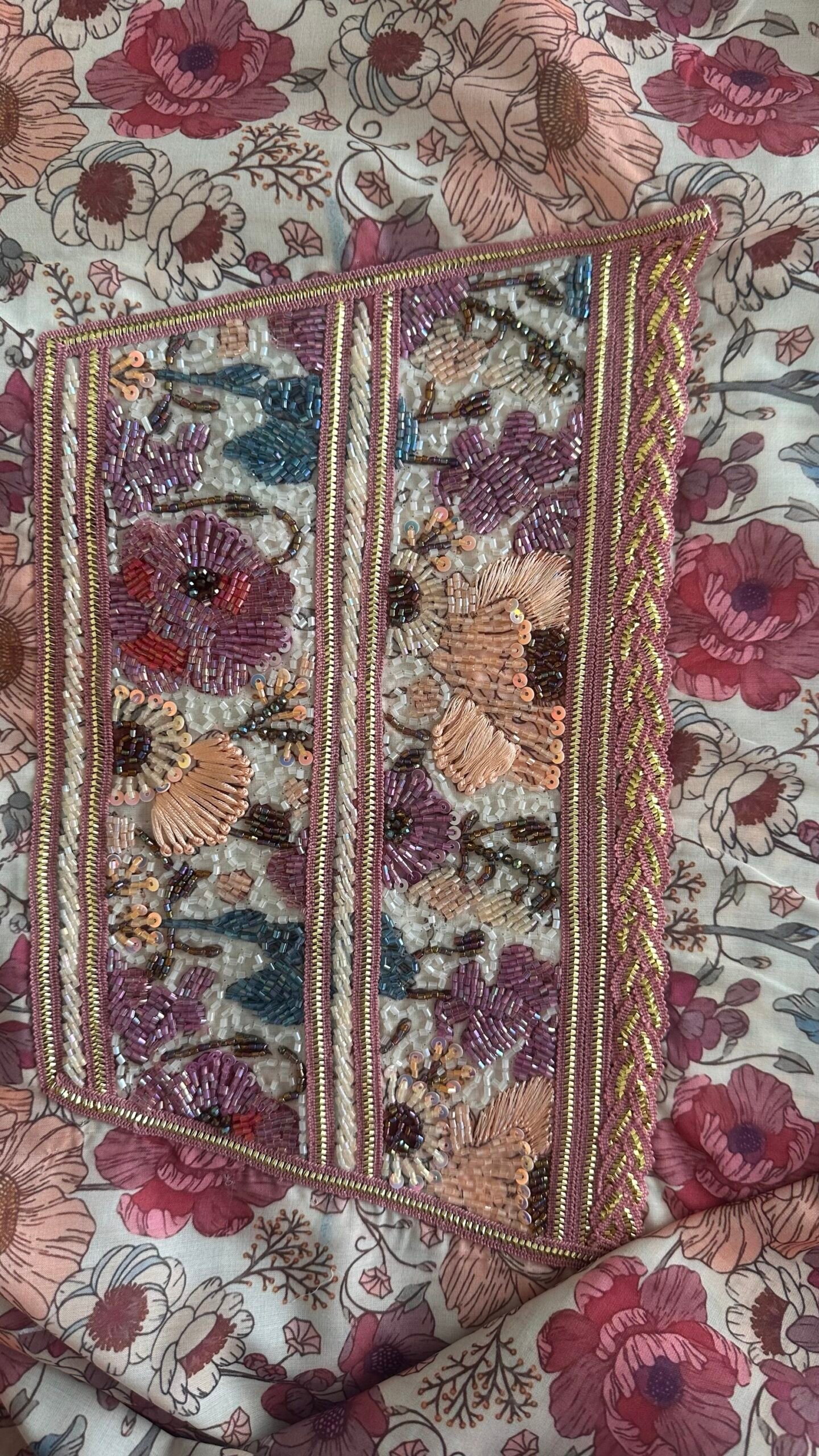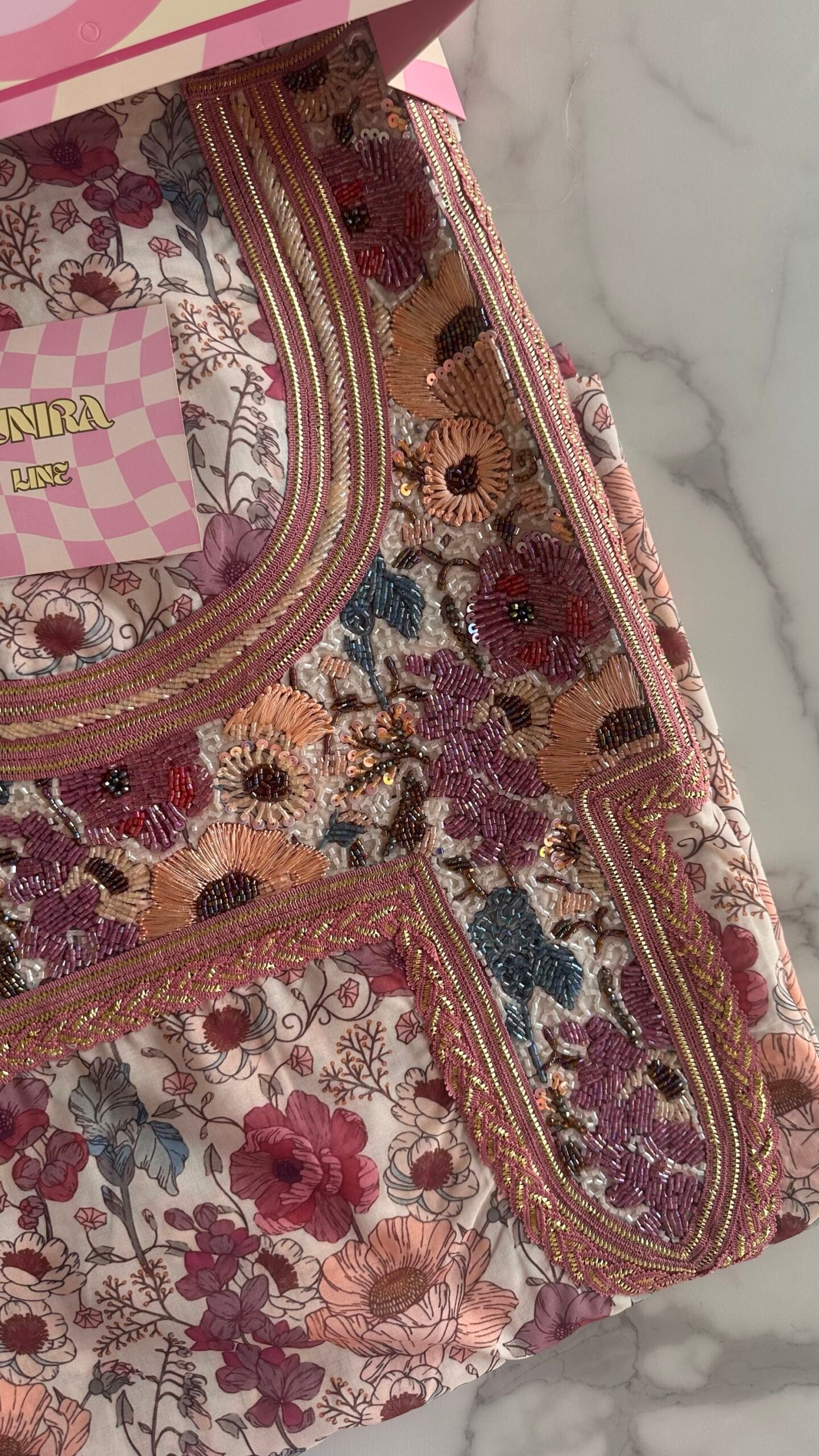 Hand wash or steam only to preserve the quality of the beading.