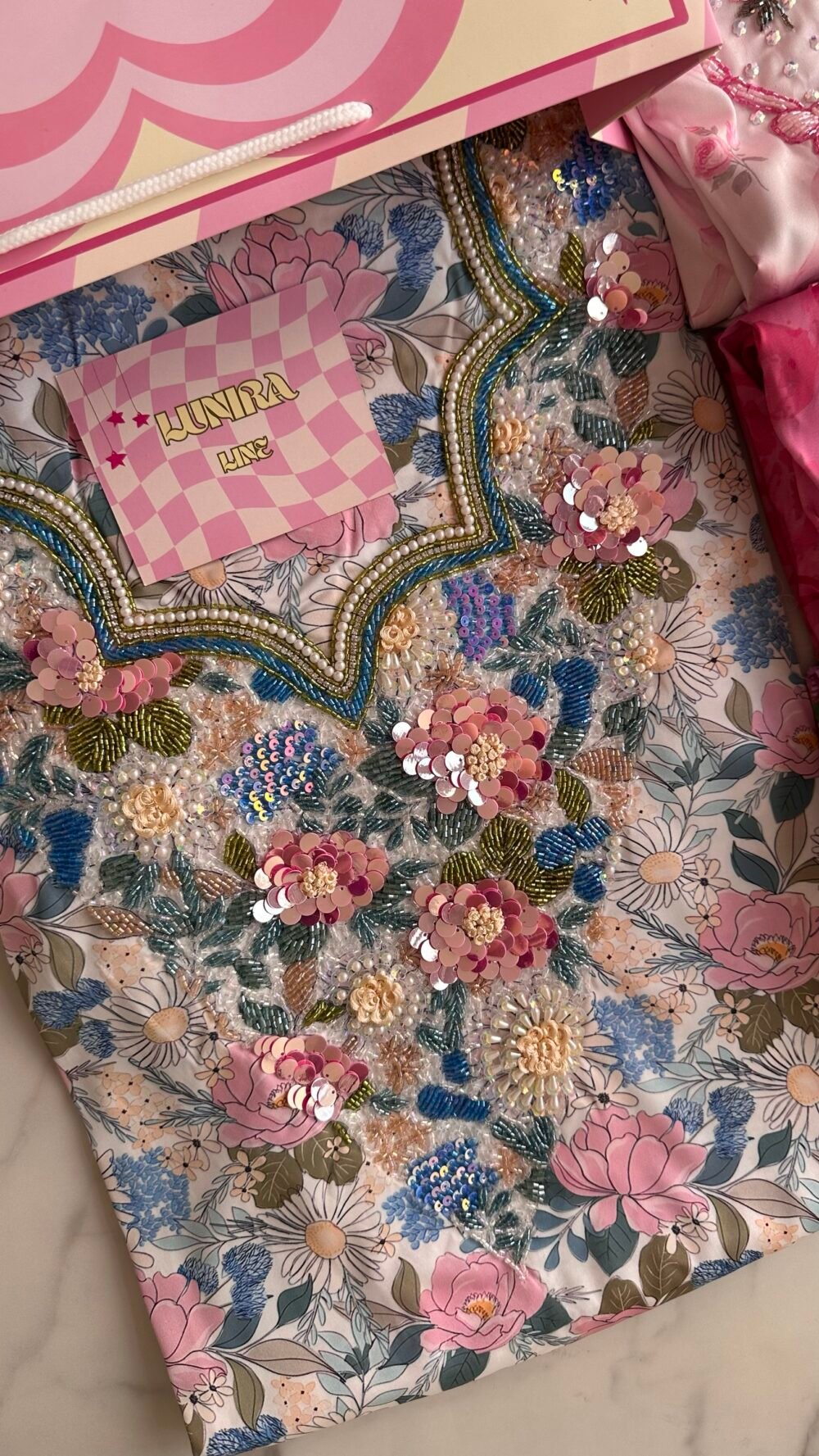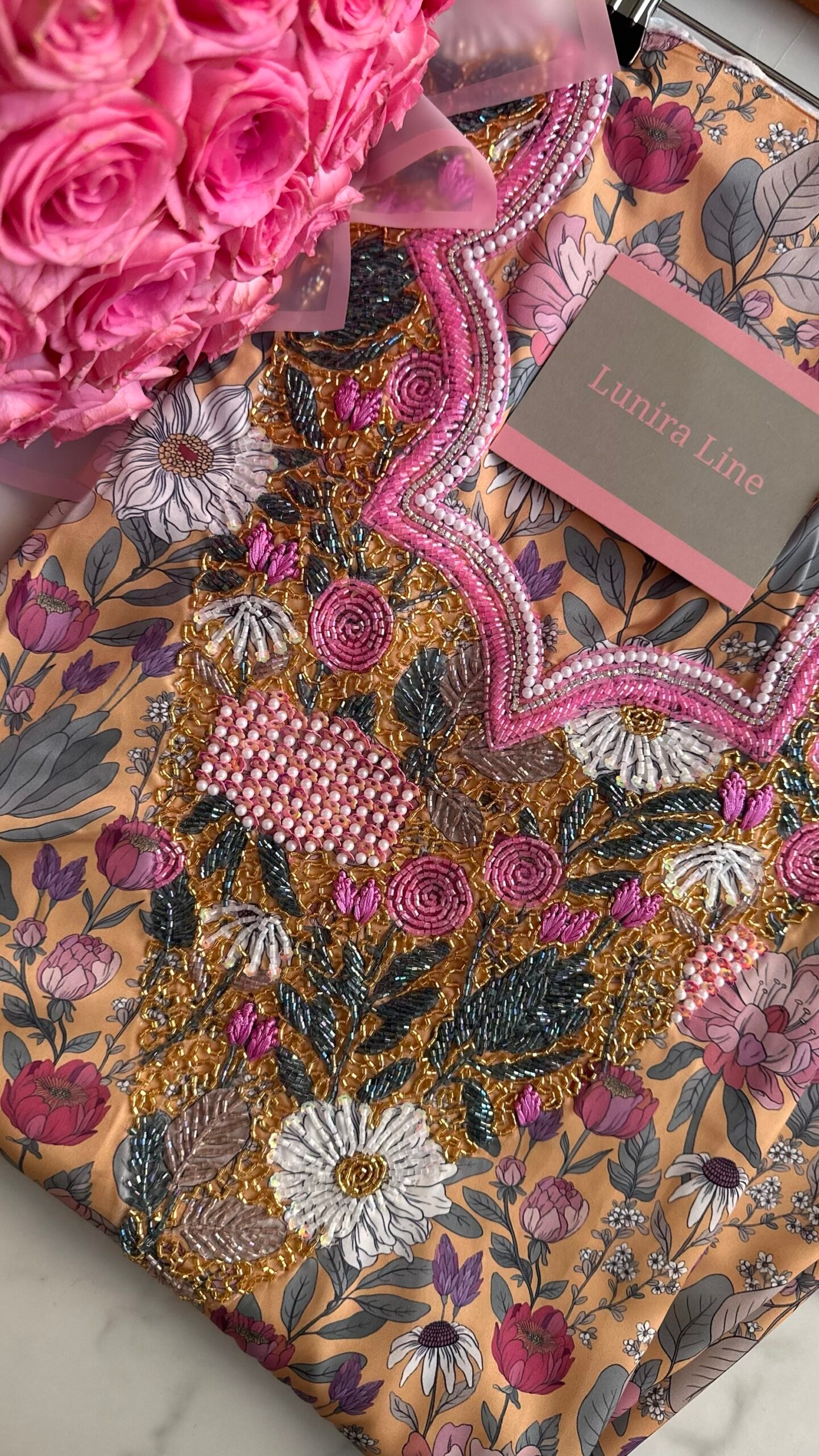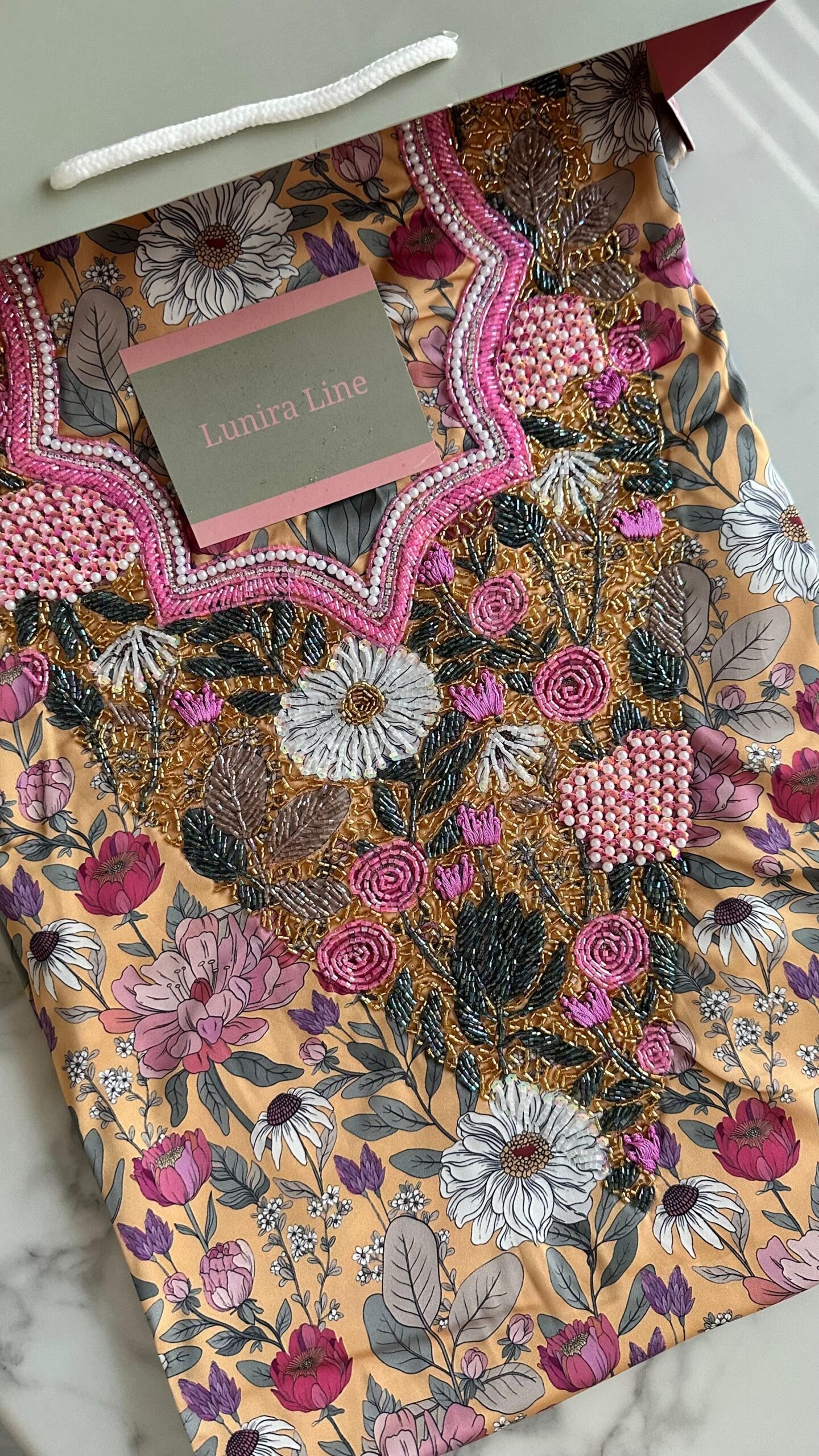 قماش حرير إيطالي، الخوار خرز شك يدوي ولولو وفولك و خيوط نايلون بدقة عالية .طول القماش 3.5 وار، و طول العرض عرضين. قياس الرقبة 7.5 انش طول في 6 انش عرض.