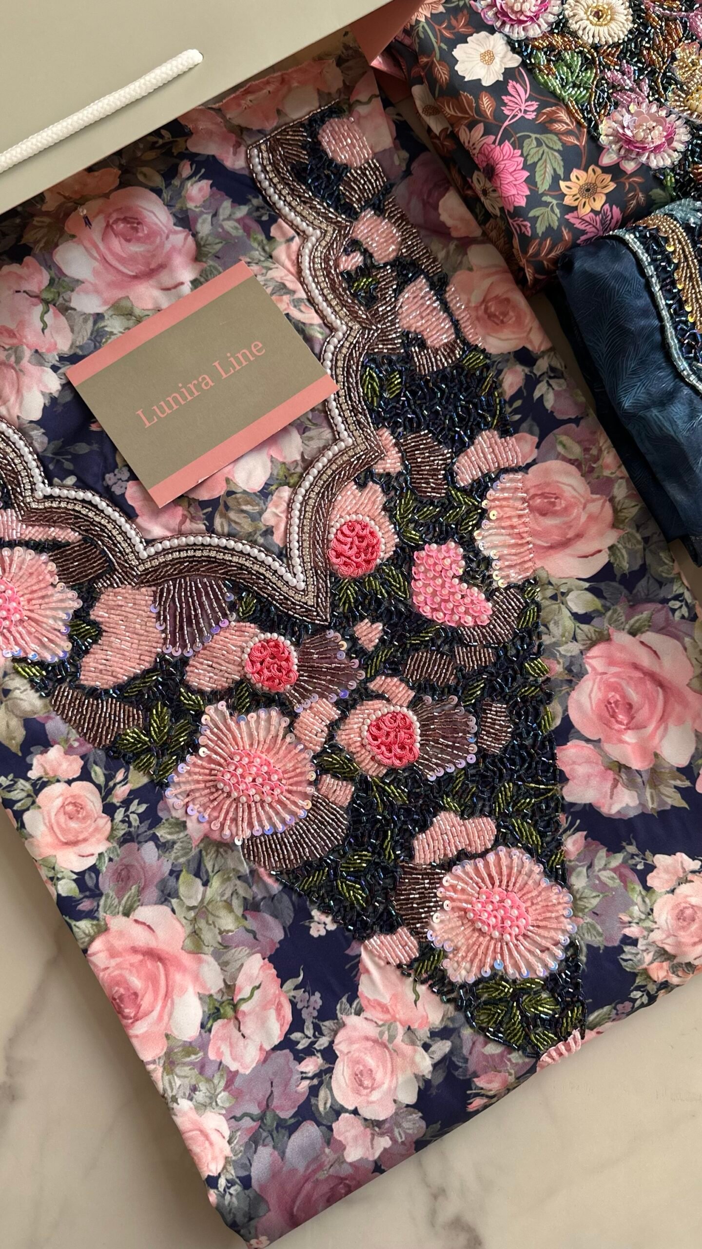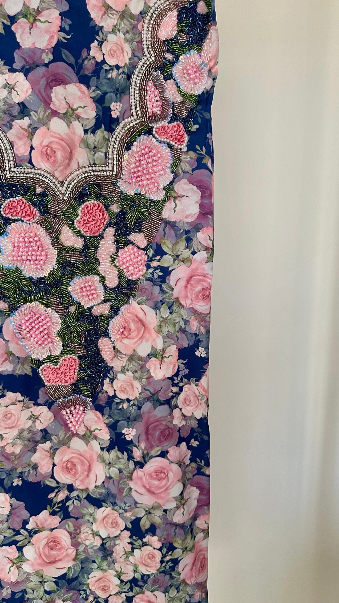 قماش حرير إيطالي، الخوار خرز شك يدوي ولولو وفولك و خيوط نايلون بدقة عالية .طول القماش 3.5 وار، و طول العرض عرضين. قياس الرقبة 8 انش طول في 7 انش عرض.