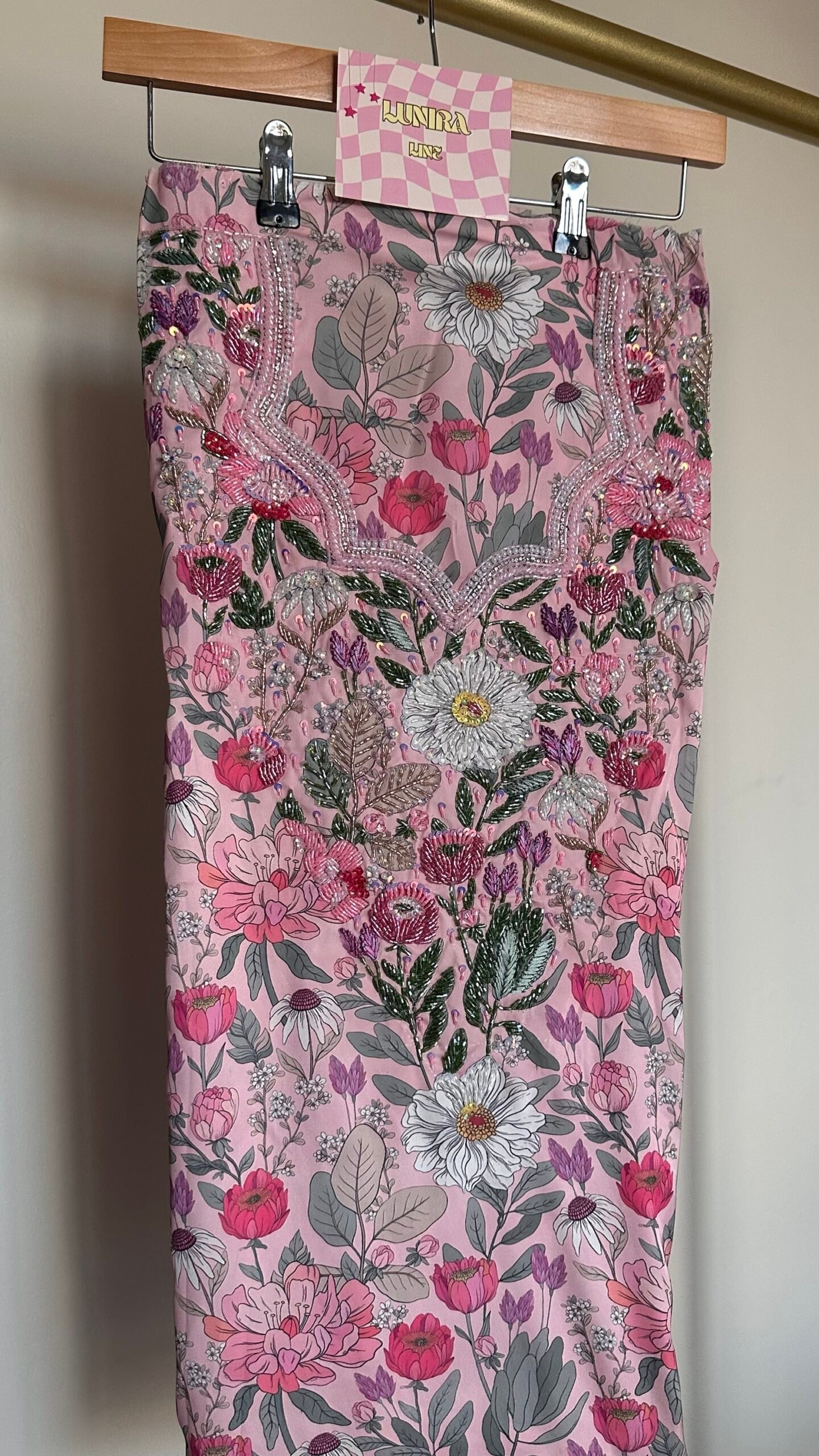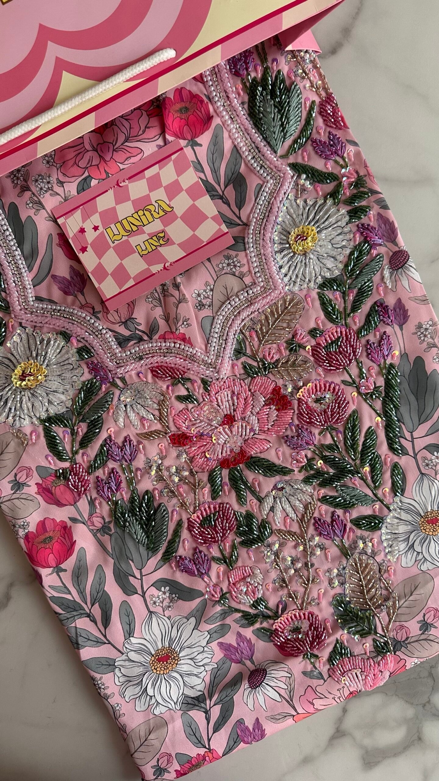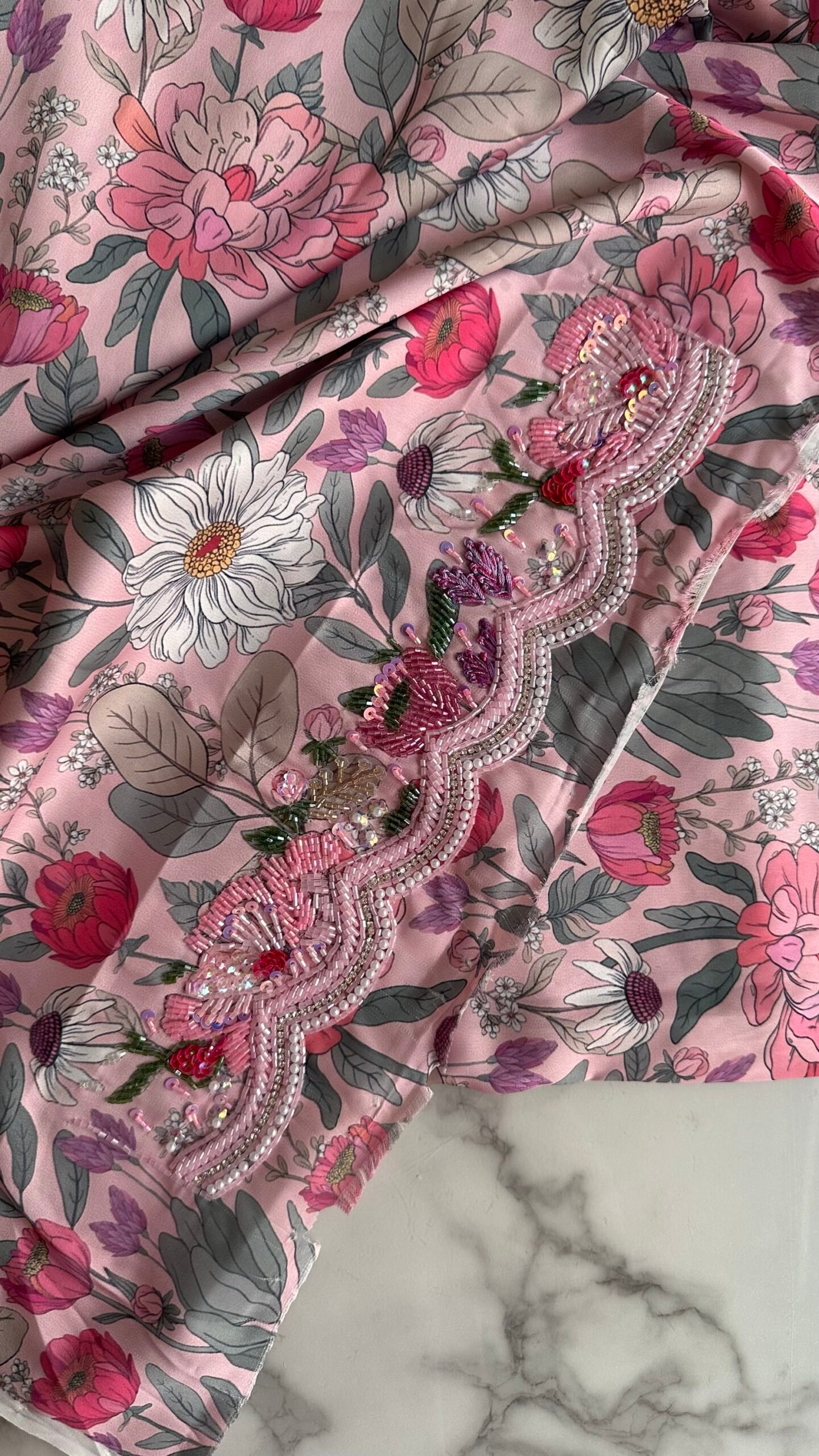 القماش حرير إيطالي، الخوار خرز شك يدوي ولولو وفولك و خيوط نايلون بدقة عالية .طول القماش 3.5 وار، و طول العرض عرضين. قياس الرقبة 8 انش طول في 7.5 انش عرض