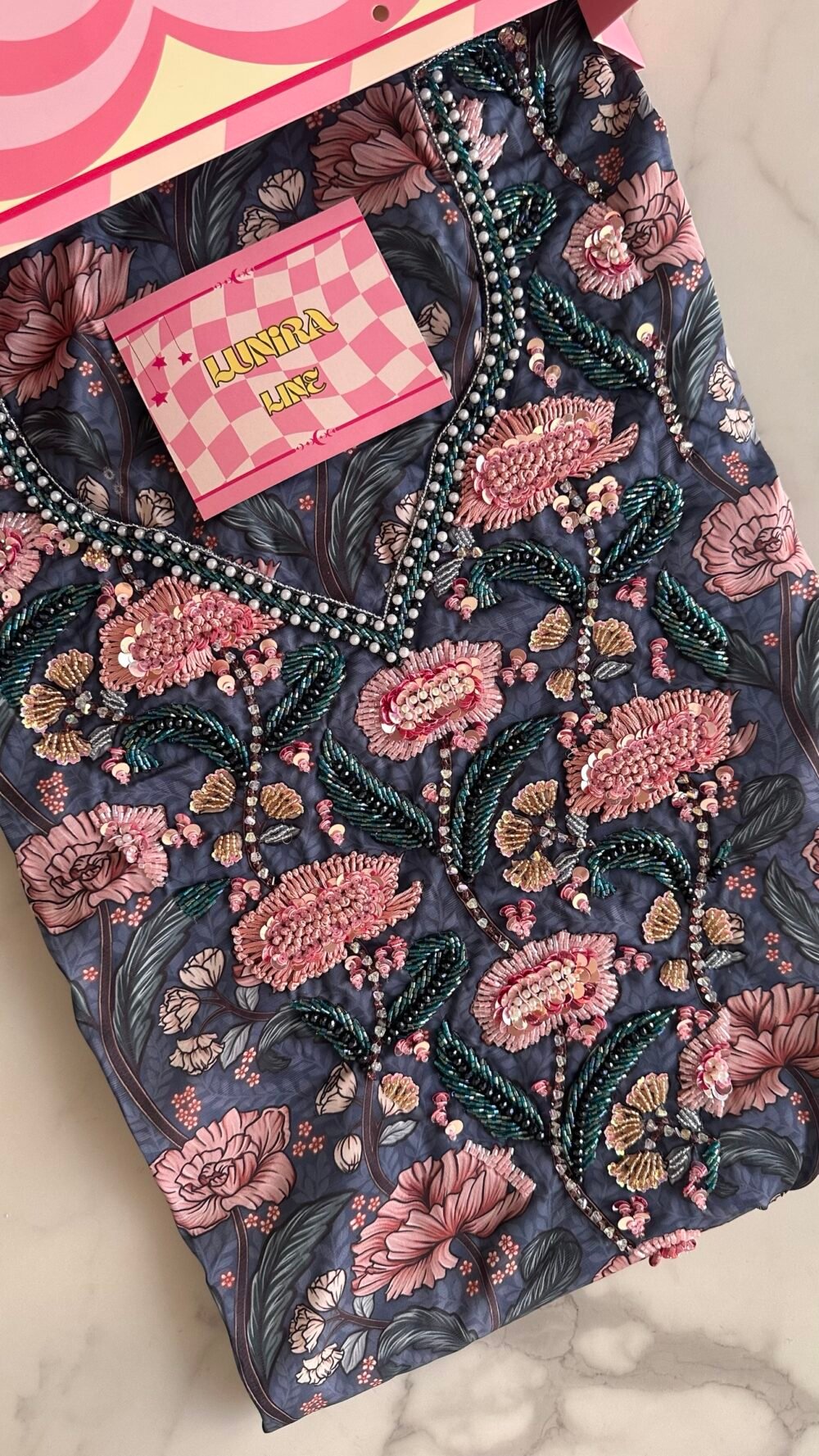لقماش حرير إيطالي، الخوار خرز شك يدوي ولولو وفولك و خيوط نايلون بدقة عالية .طول القماش 3.5 وار، و طول العرض عرضين. قياس الرقبة 7.5 انش طول في 7.5 انش عرض