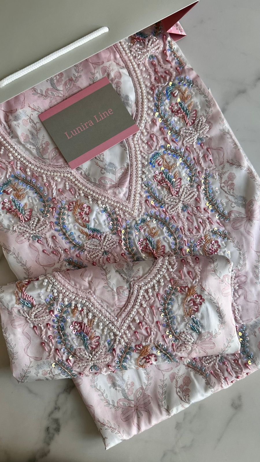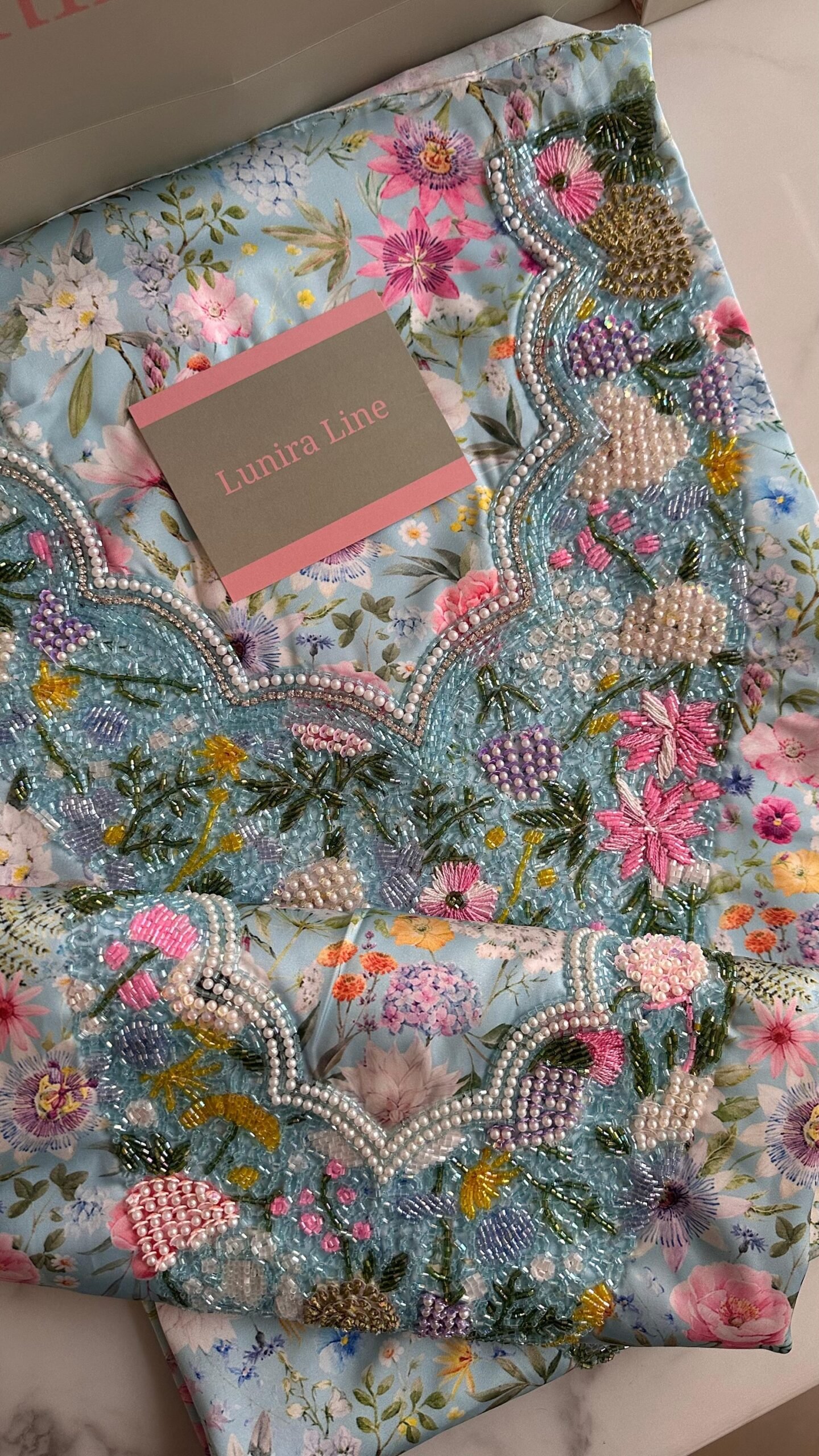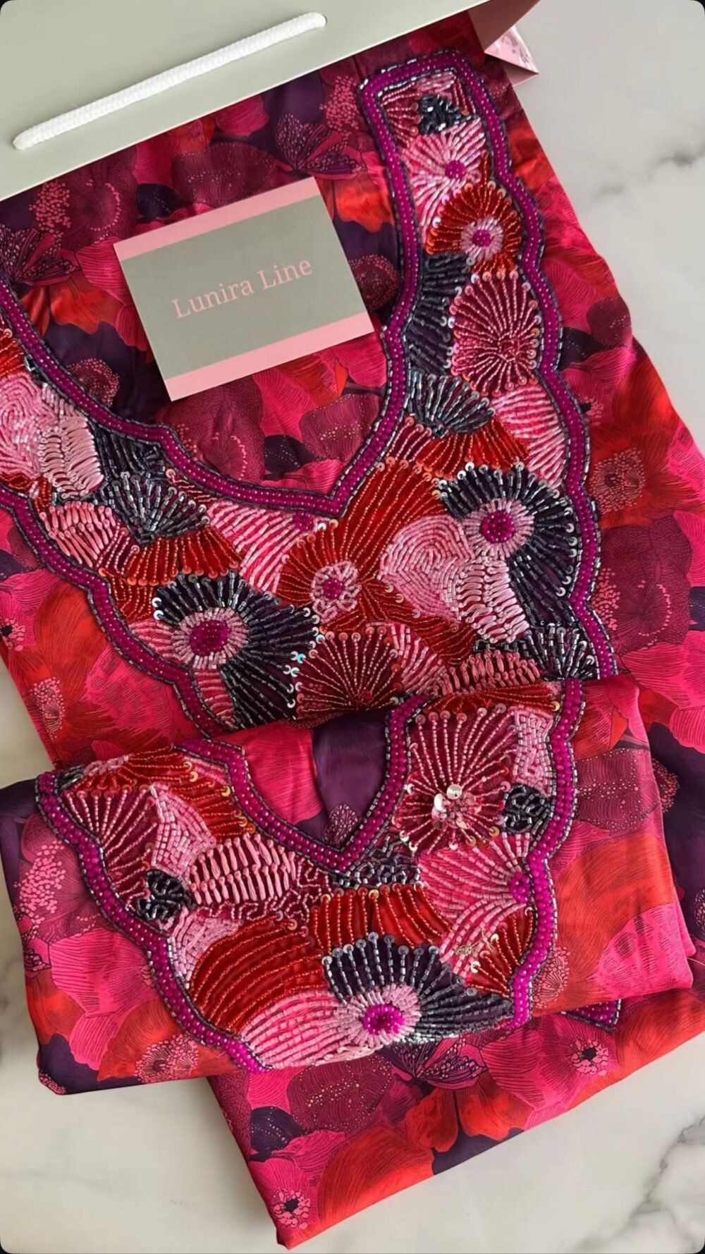 القماش حرير إيطالي، الخوار خرز شك يدوي ولولو وفولك و خيوط نايلون بدقة عالية .طول القماش 3.5 وار، و طول العرض عرضين. قياس الرقبة 7.5 انش طول في 7 انش عرض