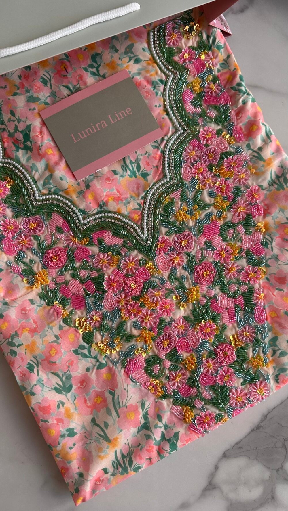 القماش حرير إيطالي، الخوار خرز شك يدوي ولولو وفولك و خيوط نايلون بدقة عالية .طول القماش 3.5 وار، و طول العرض عرضين. قياس الرقبة 7.5 انش طول في 7 انش عرض