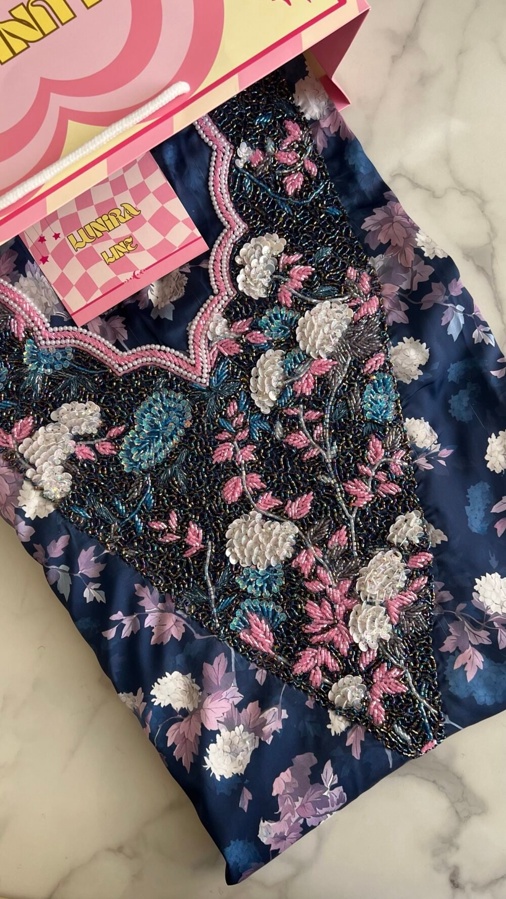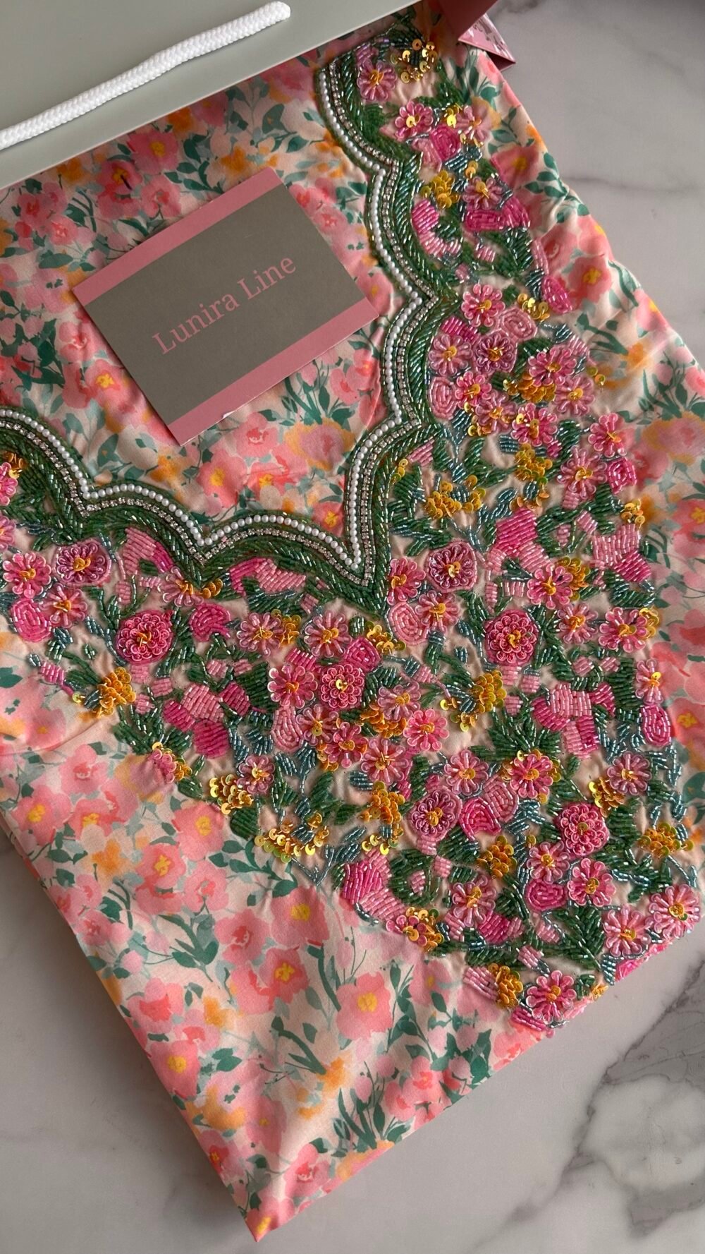 لقماش حرير إيطالي، الخوار خرز شك يدوي ولولو وفولك و خيوط نايلون بدقة عالية .طول القماش 3.5 وار، و طول العرض عرضين. قياس الرقبة 8 انش طول في 7.5 انش عرض