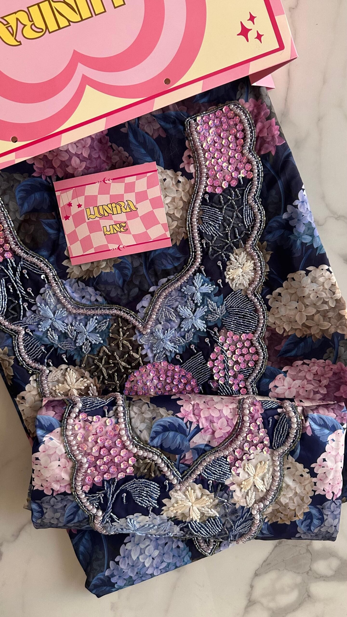 القماش حرير إيطالي، الخوار خرز شك يدوي ولولو وفولك و خيوط نايلون بدقة عالية .طول القماش 3.5 وار، و طول العرض عرضين. قياس الرقبة 7.5 انش طول في 7 انش عرض