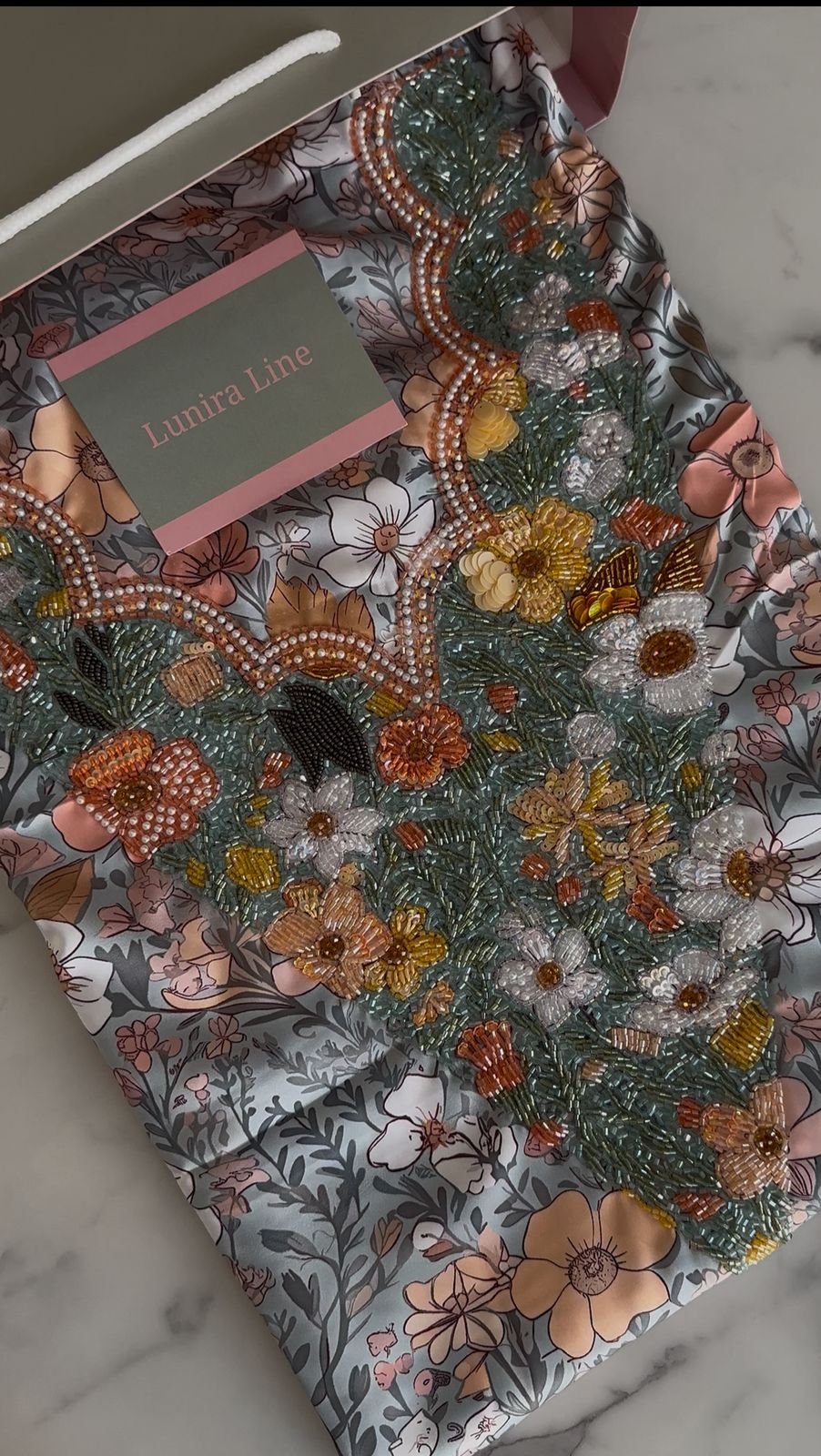 القماش حرير إيطالي، الخوار خرز شك يدوي ولولو وفولك و خيوط نايلون بدقة عالية .طول القماش 3.5 وار، و طول العرض عرضين. قياس الرقبة 8 انش طول في 8 انش عرض