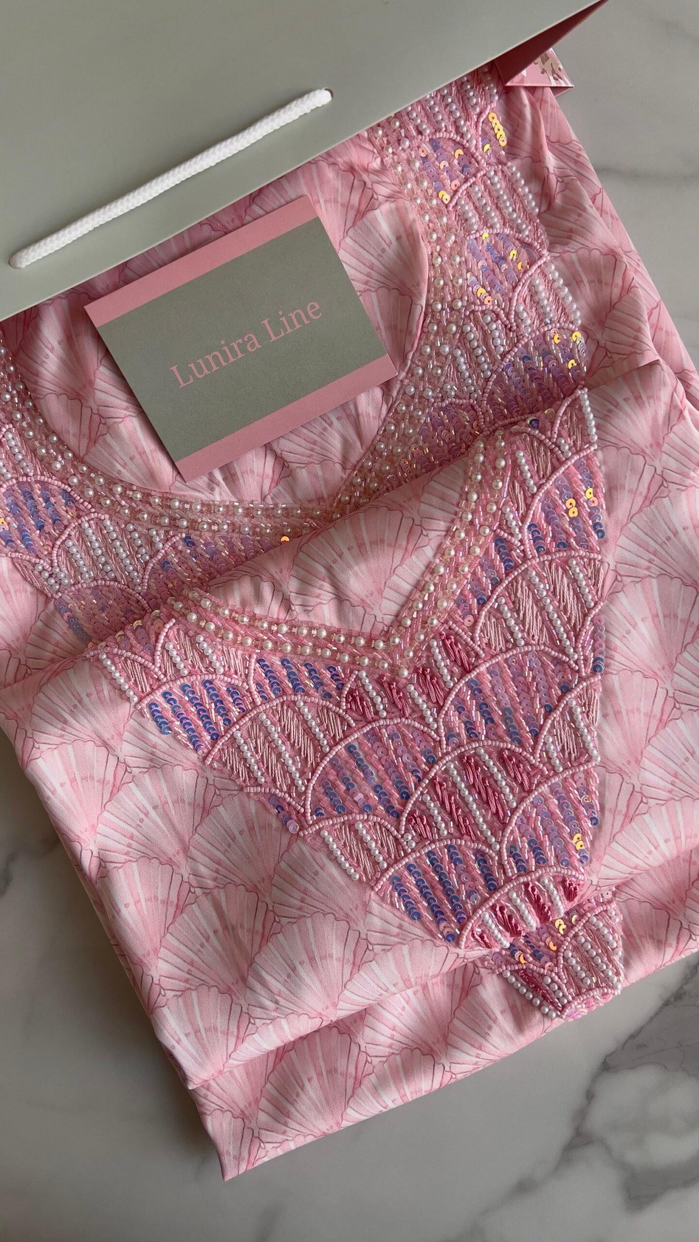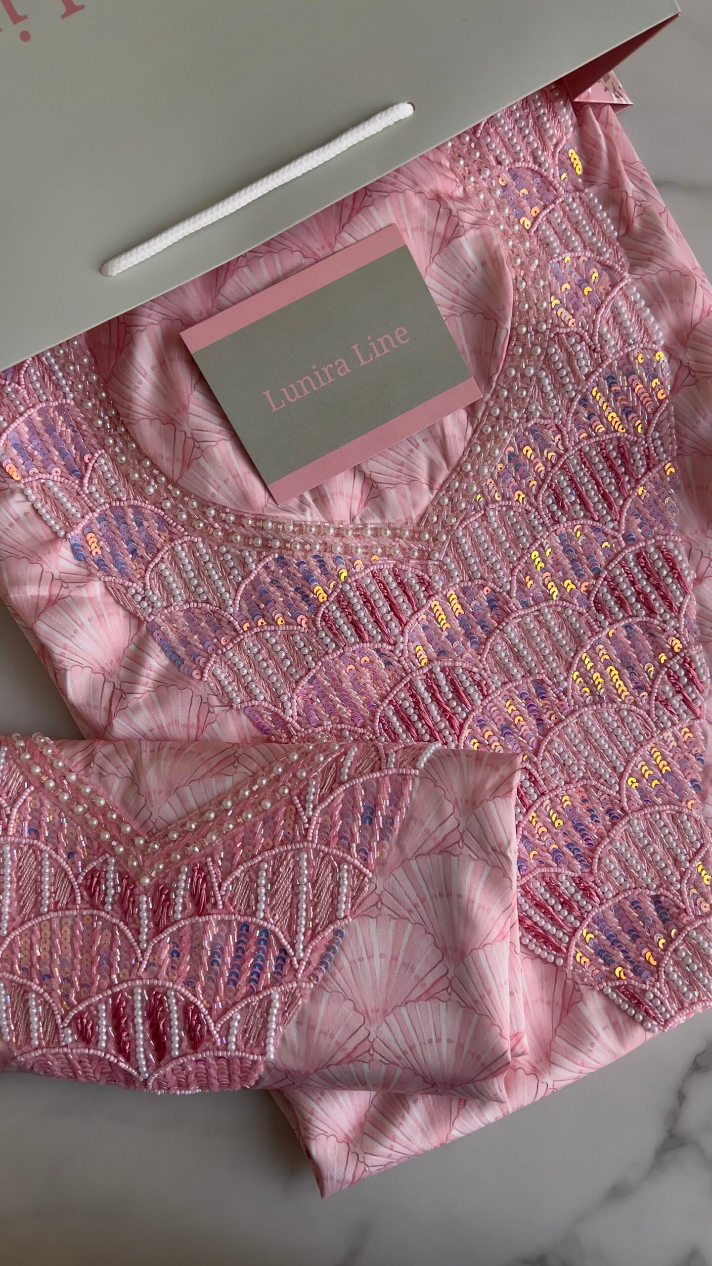 القماش حرير إيطالي، الخوار خرز شك يدوي ولولو وفولك و خيوط نايلون بدقة عالية .طول القماش 3.5 وار، و طول العرض عرضين. قياس الرقبة 7.5 انش طول في 7 انش عرض