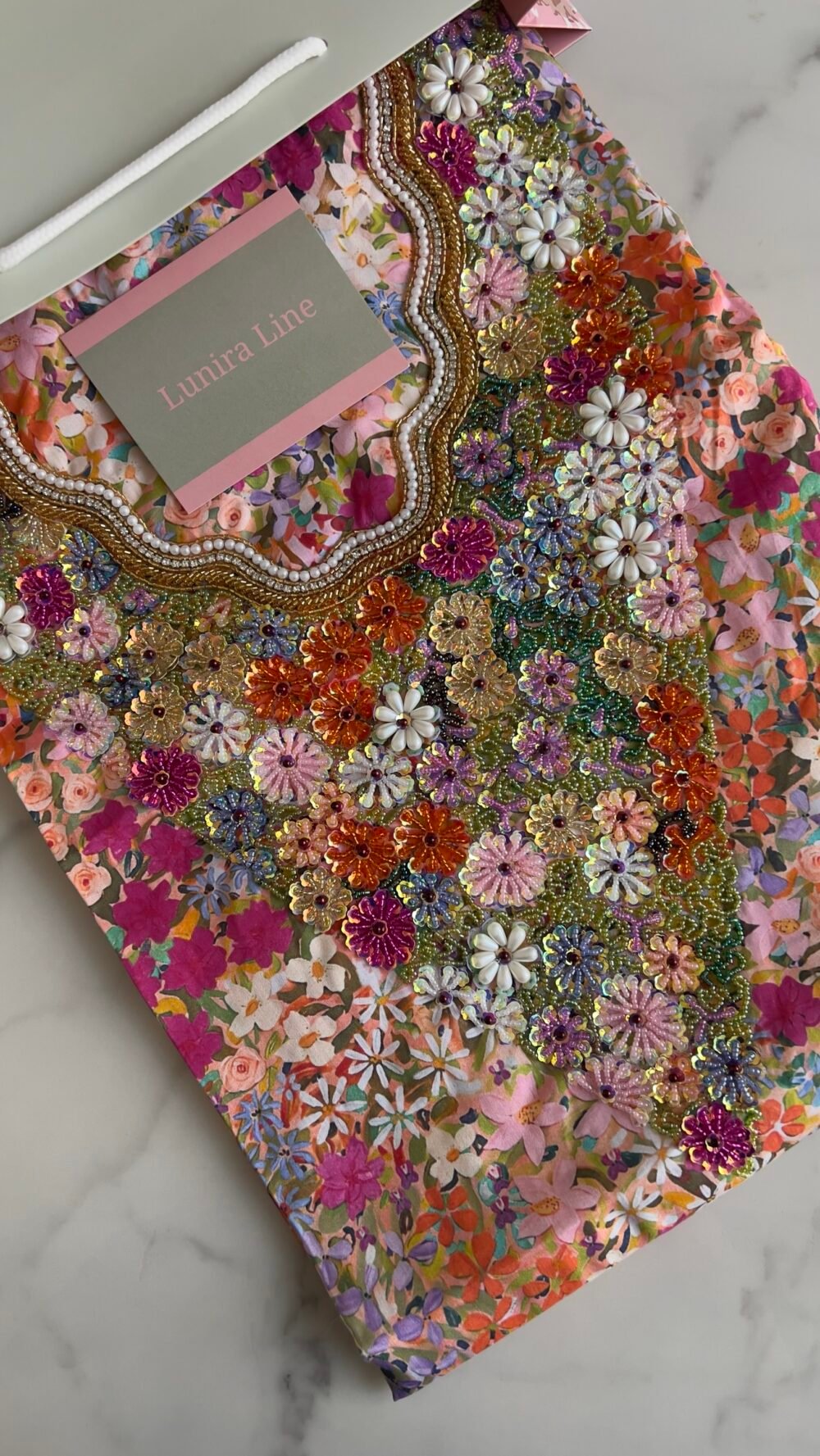 القماش حرير إيطالي، الخوار خرز شك يدوي ولولو وفولك و خيوط نايلون بدقة عالية .طول القماش 3.5 وار، و طول العرض عرضين. قياس الرقبة 8.3 انش طول في 7.5 انش عرض