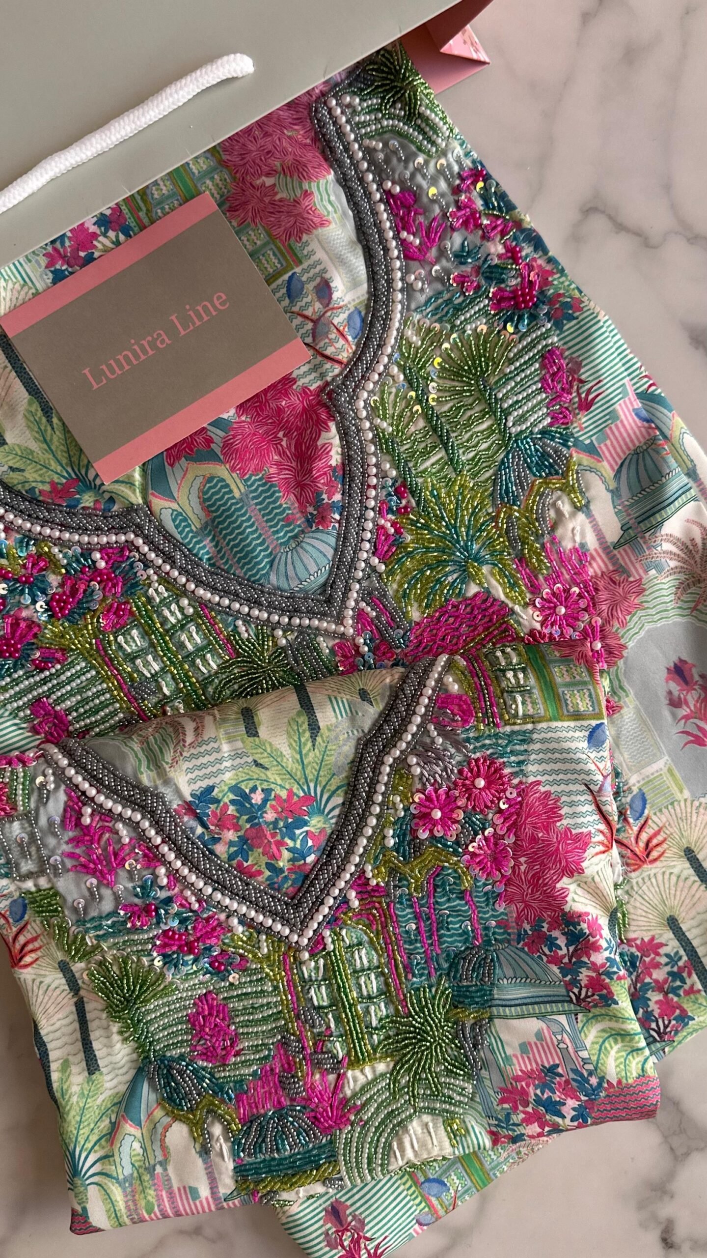 القماش حرير إيطالي، الخوار خرز شك يدوي ولولو وفولك و خيوط نايلون بدقة عالية .طول القماش 3.5 وار، و طول العرض عرضين. قياس الرقبة 7.5 انش طول في 7 انش عرض