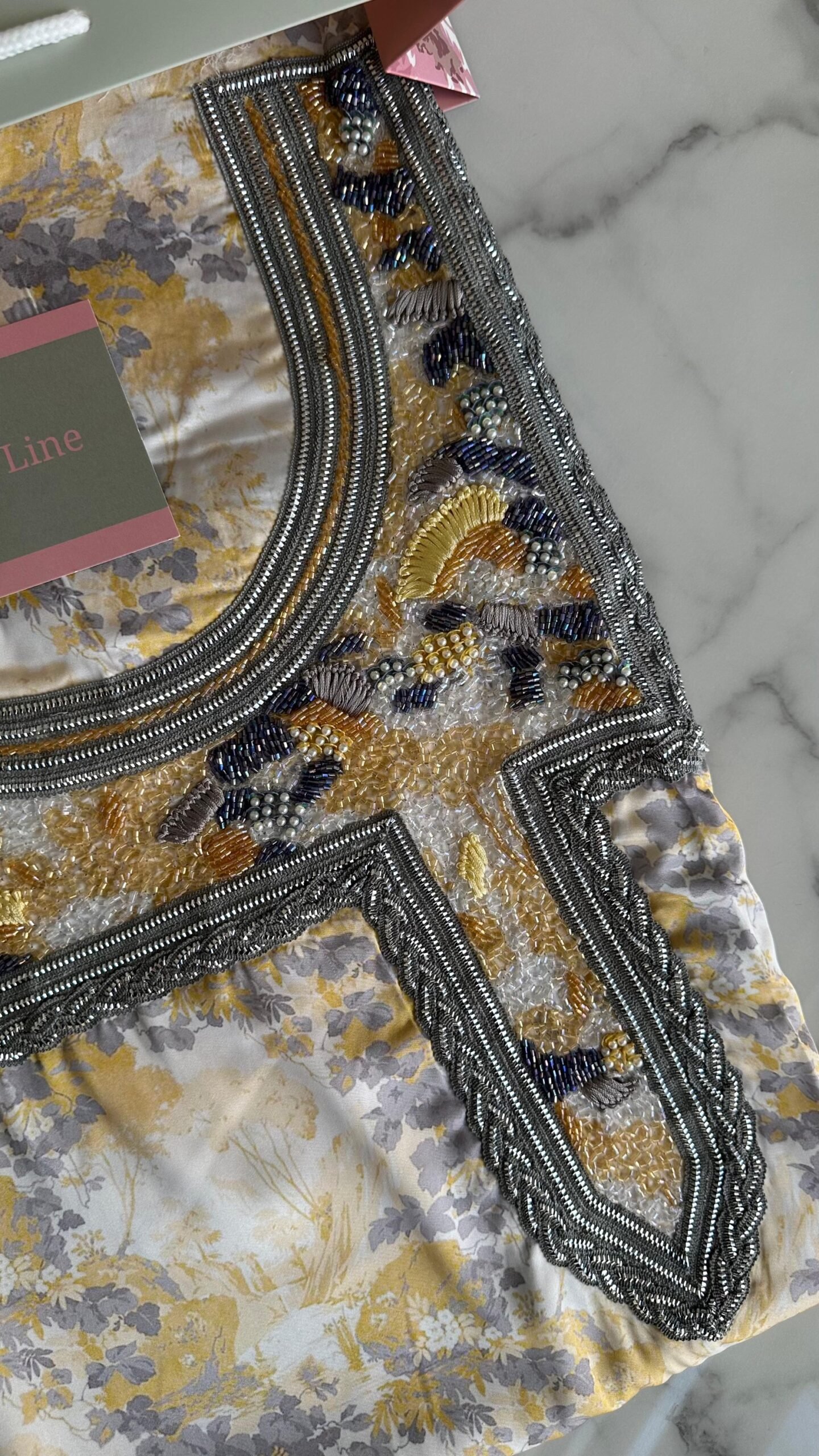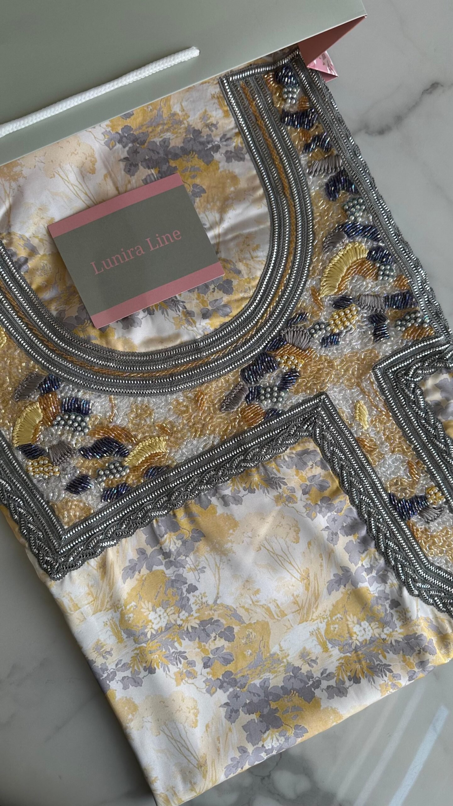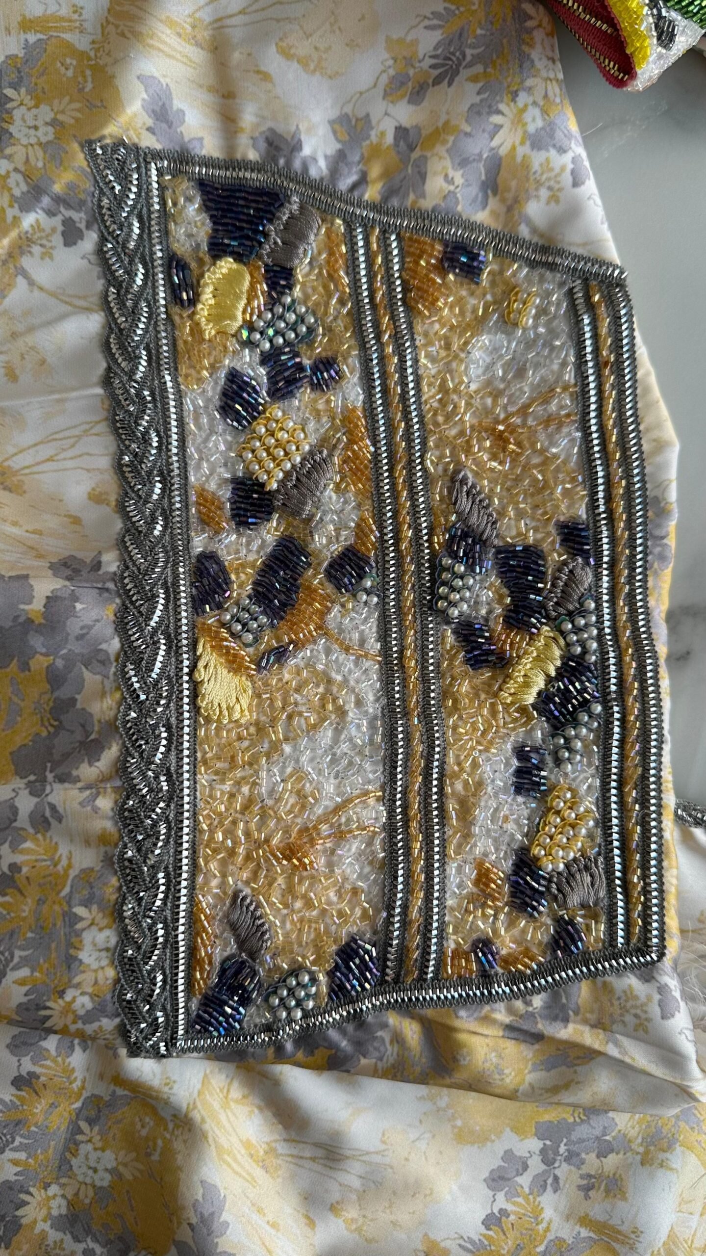 القماش حرير ايطالي، الخوار خرز شك يدوي ولولو وفولك و خيوط نايلون بدقة عالية .طول القماش 3.5 وار، و طول العرض عرضين. قياس الرقبة 7.2 انش طول في 7 انش عرض