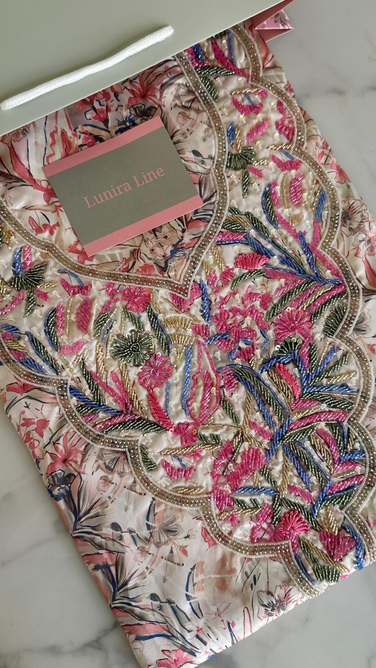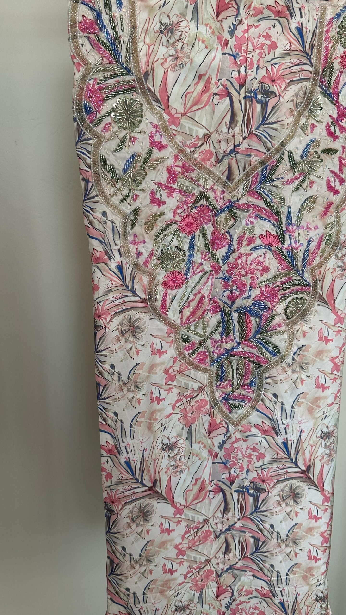 القماش حرير إيطالي، الخوار خرز شك يدوي ولولو وفولك و خيوط نايلون بدقة عالية .طول القماش 3.5 وار، و طول العرض عرضين. قياس الرقبة 7 انش طول في 7 انش عرض
