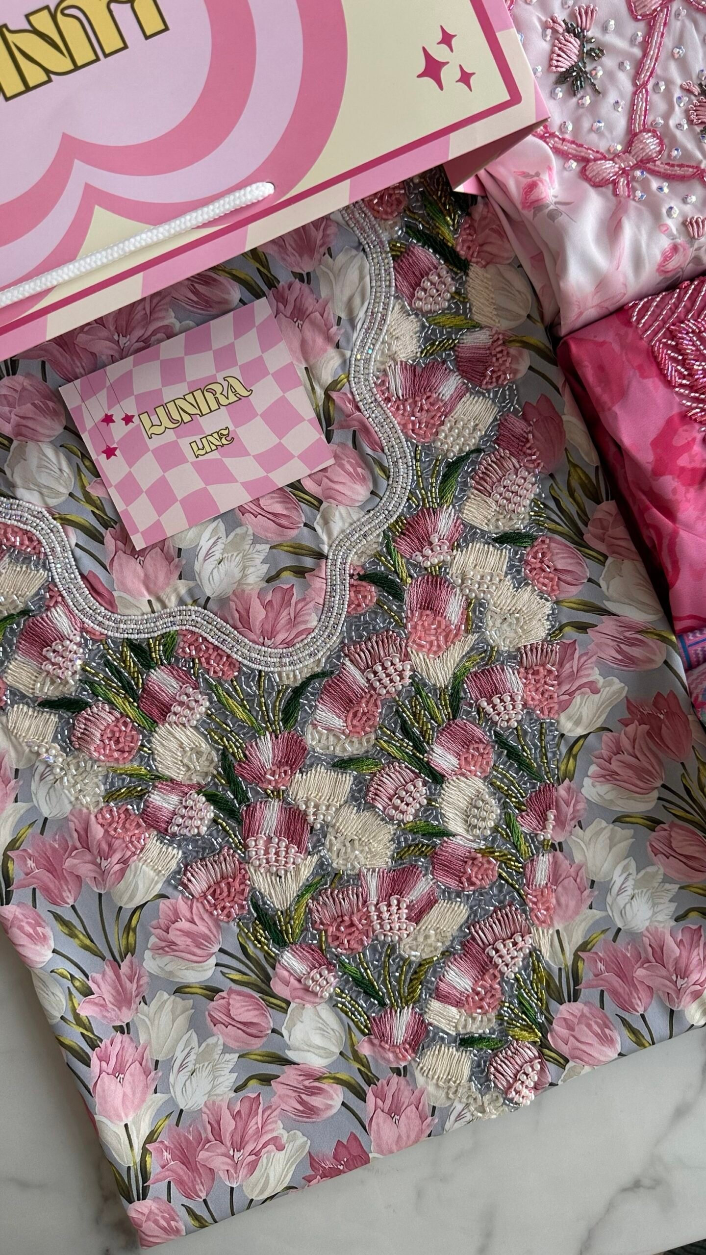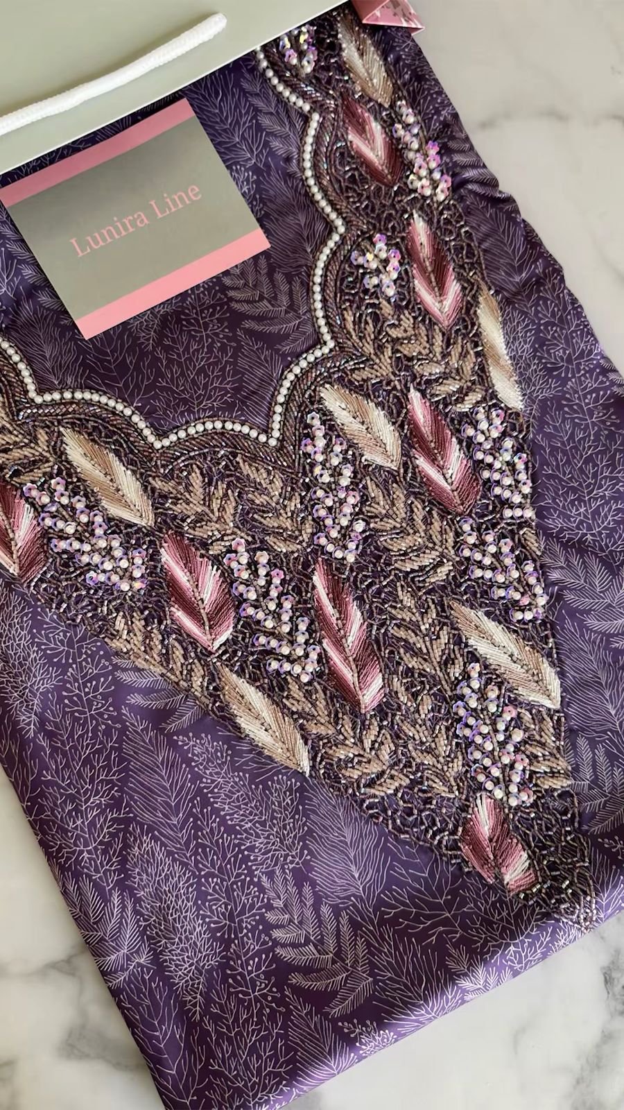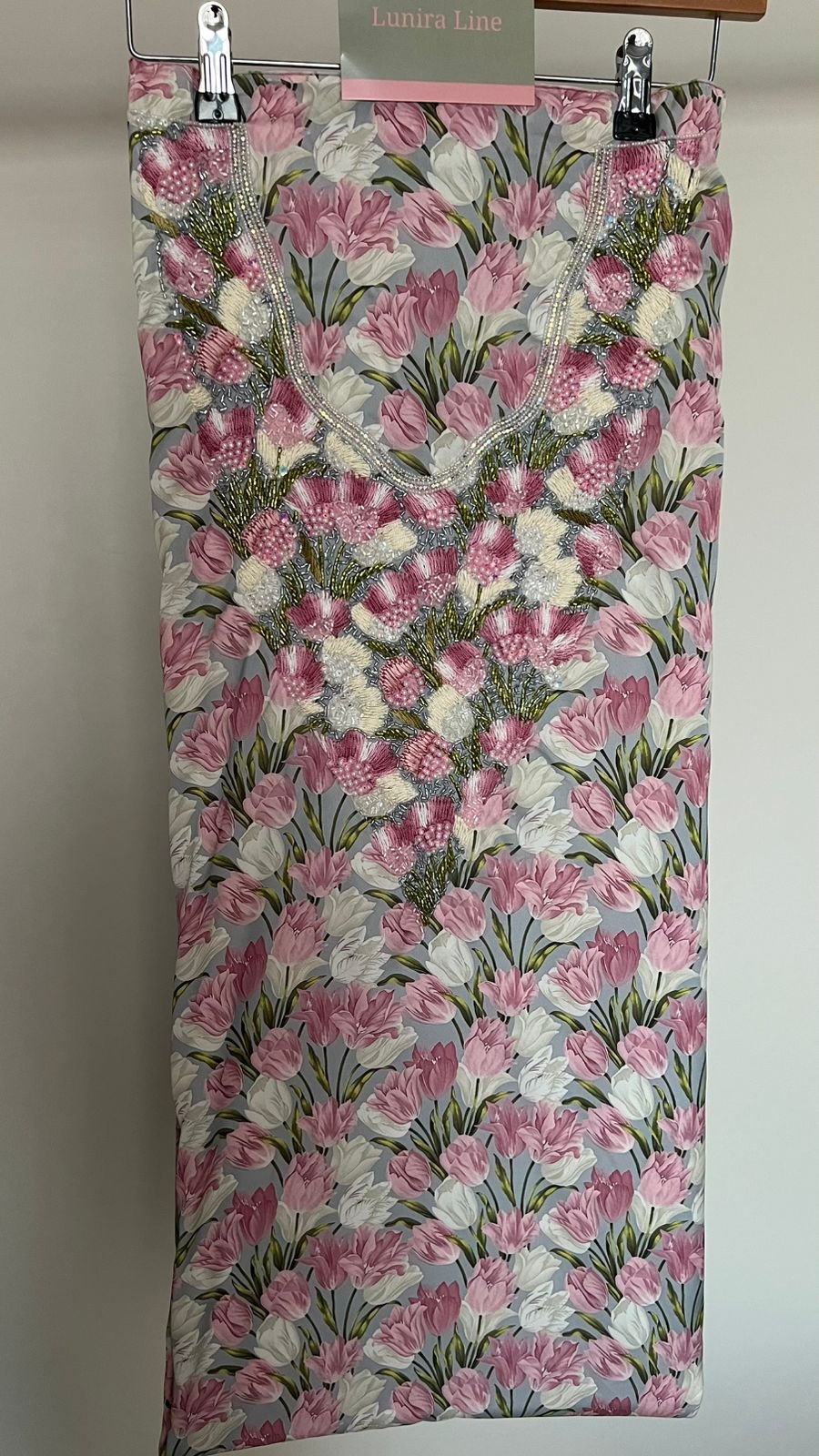 القماش حرير إيطالي، الخوار خرز شك يدوي ولولو وفولك و خيوط نايلون بدقة عالية .طول القماش 3.5 وار، و طول العرض عرضين. قياس الرقبة 8 انش طول في 7.5 انش عرض