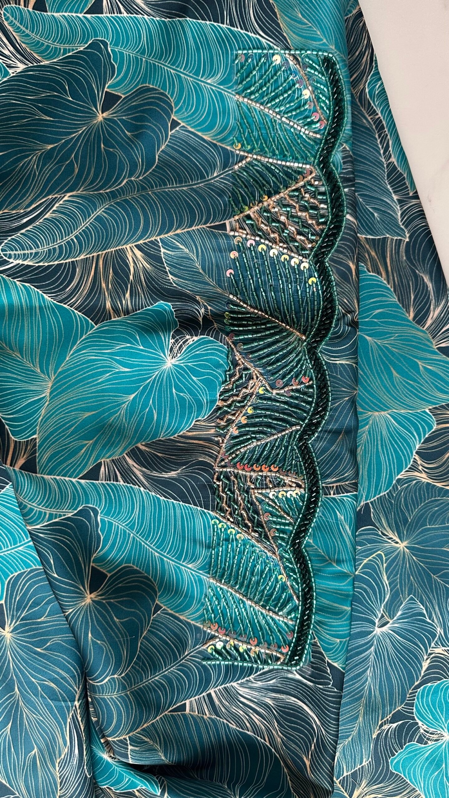 القماش حرير إيطالي، الخوار خرز شك يدوي ولولو وفولك و خيوط نايلون بدقة عالية .طول القماش 3.5 وار، و طول العرض عرضين. قياس الرقبة 8 انش طول في 7 انش عرض