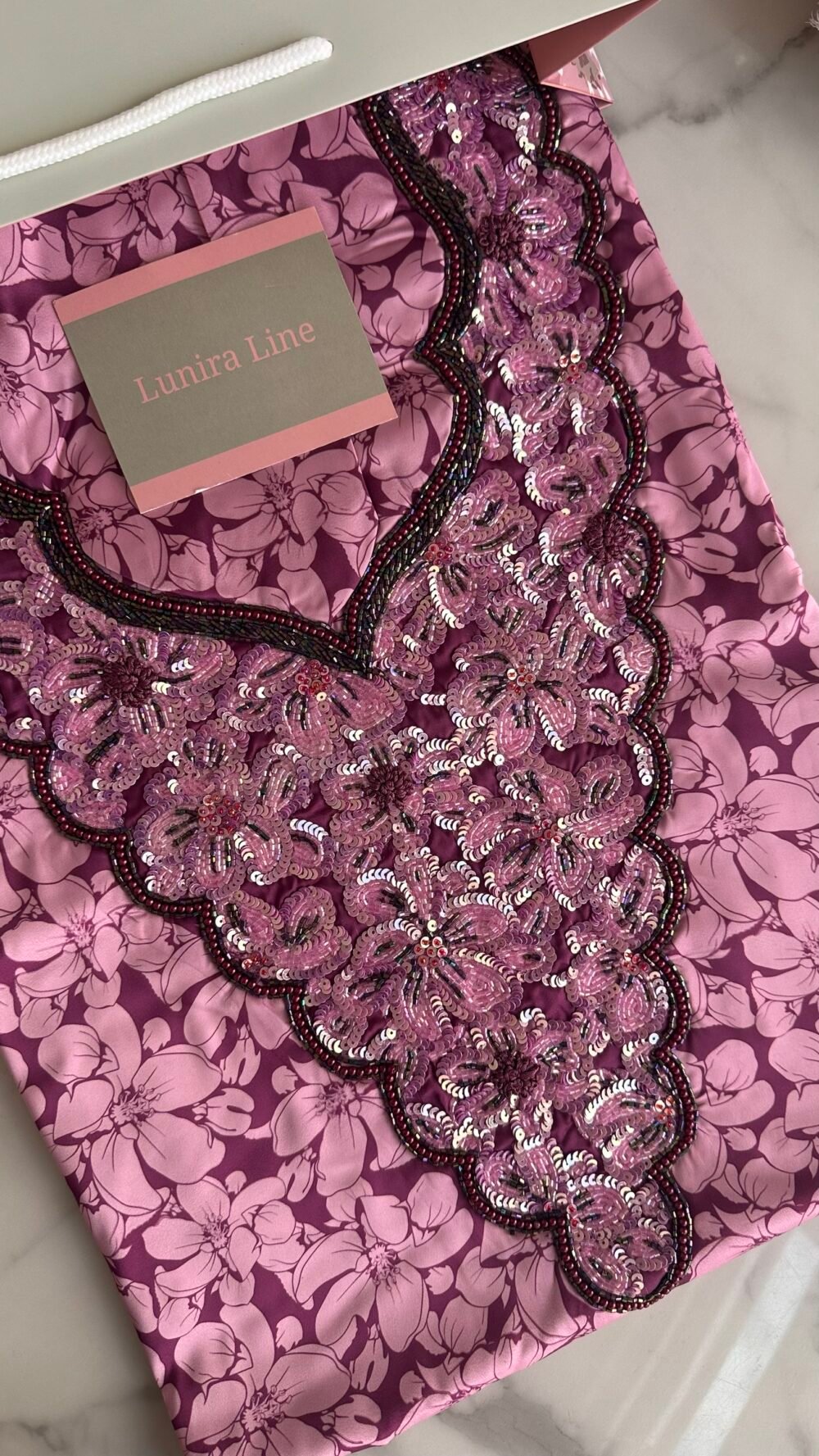 القماش حرير إيطالي، الخوار خرز شك يدوي ولولو وفولك و خيوط نايلون بدقة عالية .طول القماش 3.5 وار، و طول العرض عرضين. قياس الرقبة 8 انش طول في 7.2 انش عرض