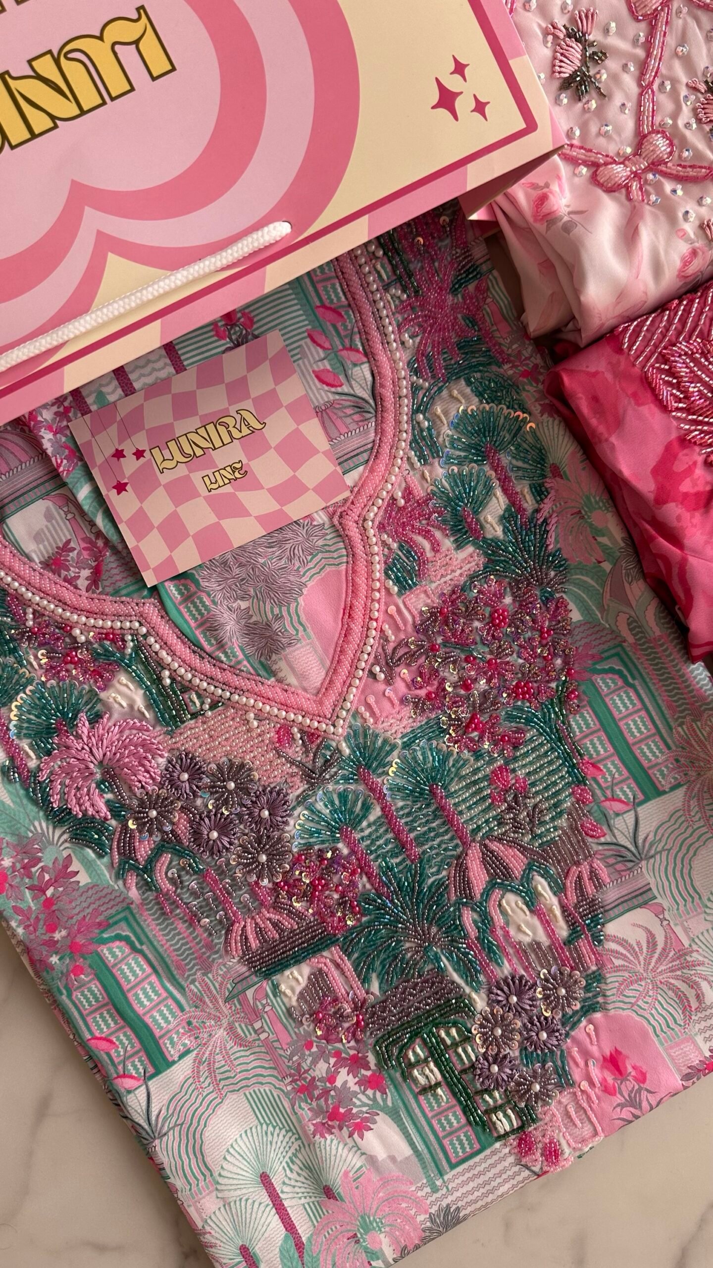 القماش حرير إيطالي، الخوار خرز شك يدوي ولولو وفولك و خيوط نايلون بدقة عالية .طول القماش 3.5 وار، و طول العرض عرضين. قياس الرقبة 7.7 انش طول في 7 انش عرض