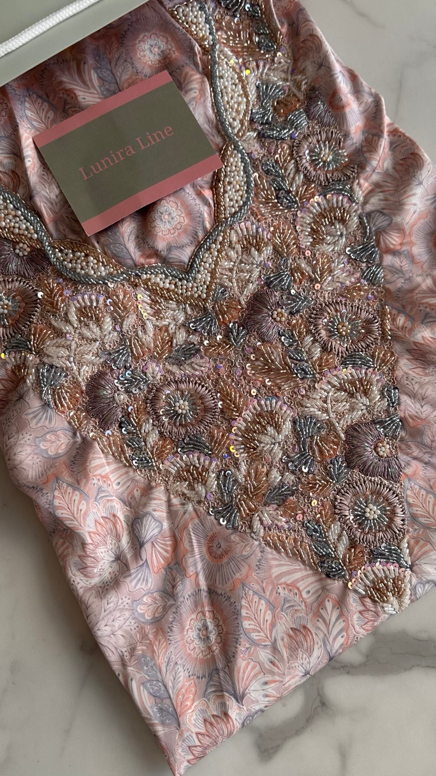 القماش حرير إيطالي، الخوار خرز شك يدوي ولولو وفولك و خيوط نايلون بدقة عالية .طول القماش 3.5 وار، و طول العرض عرضين. قياس الرقبة 7.7 انش طول في 7.2 انش عرض