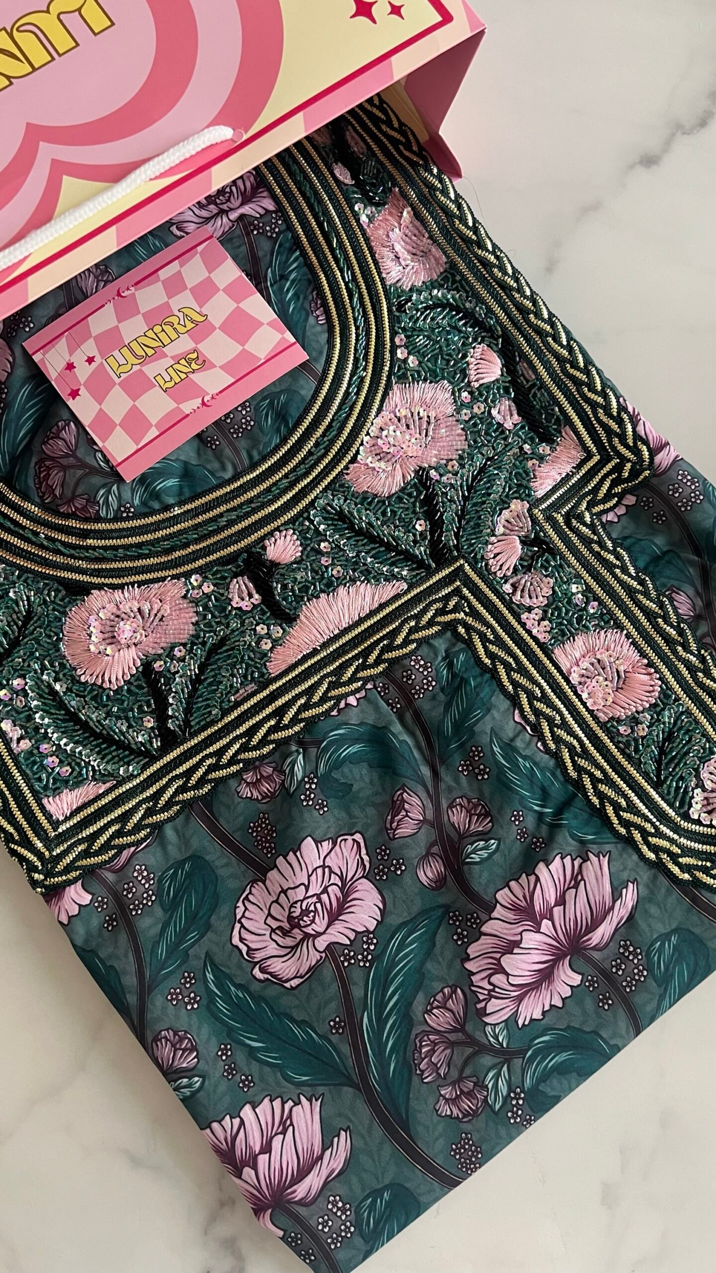 القماش قطن ديجتال، الخوار خرز شك يدوي ولولو وفولك و خيوط نايلون بدقة عالية .طول القماش 4 وار. قياس الرقبة 8.7 انش طول في 7.3 انش عرض