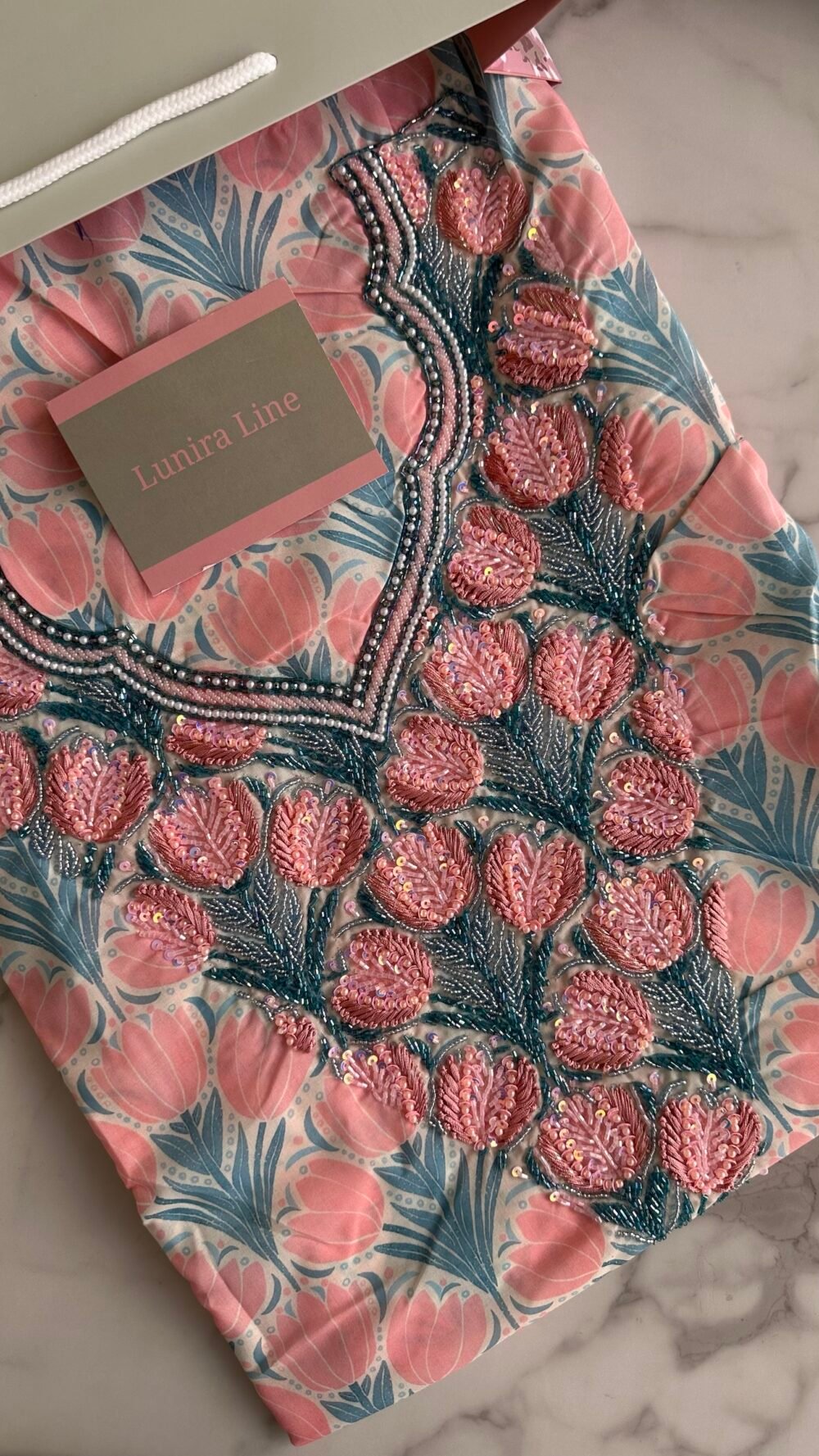 القماش قطن ليبرتي، الخوار خرز شك يدوي ولولو وفولك و خيوط نايلون بدقة عالية .طول القماش 4 وار. قياس الرقبة 7.5انش طول في 7 انش عرض