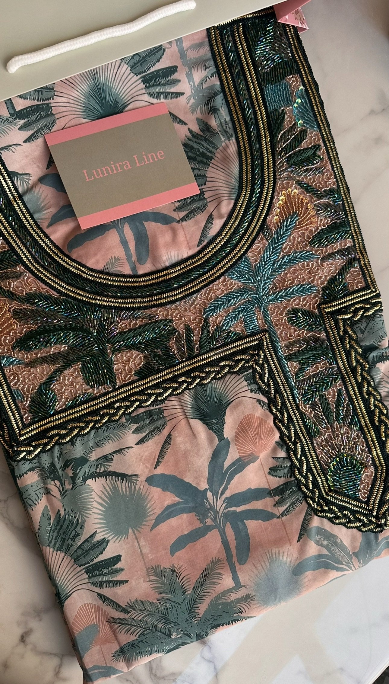 القماش قطن ليبرتي، الخوار خرز شك يدوي ولولو وفولك و خيوط نايلون بدقة عالية .طول القماش 4 وار. قياس الرقبة 7.5انش طول في 7 انش عرض