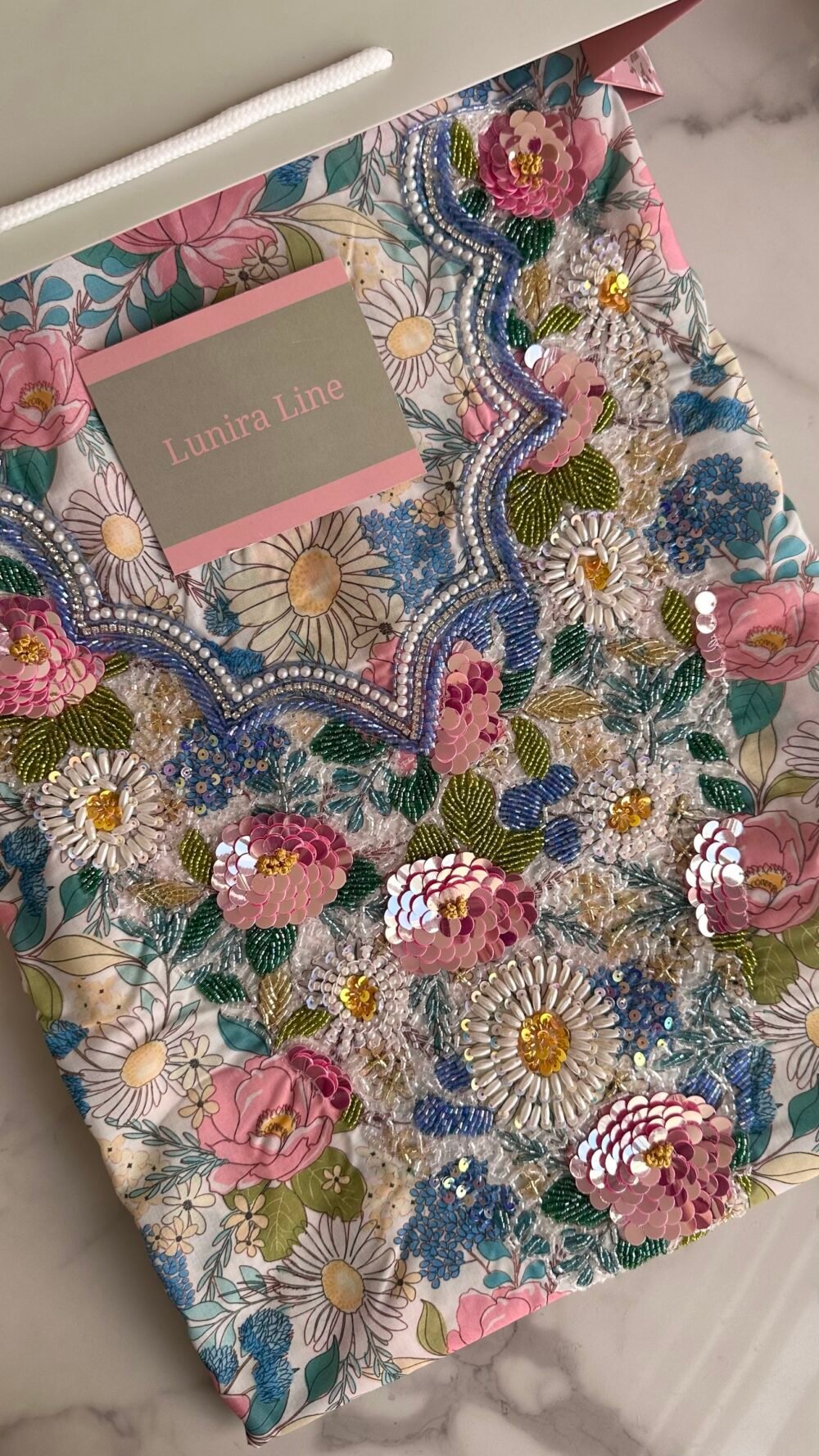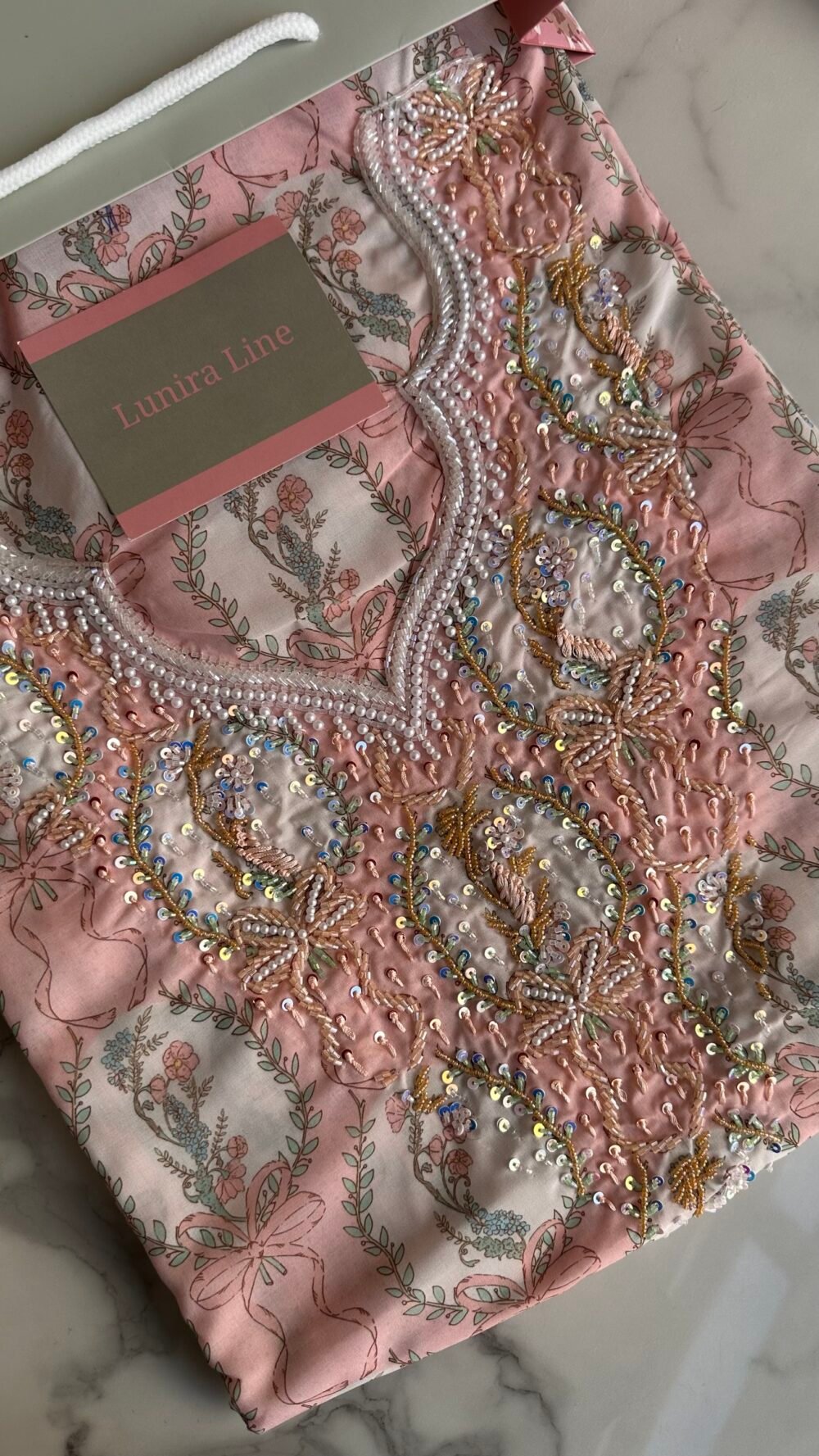 القماش قطن ليبرتي، الخوار خرز شك يدوي ولولو وفولك و خيوط نايلون بدقة عالية .طول القماش 4 وار. قياس الرقبة 8 انش طول في 7 انش عرض