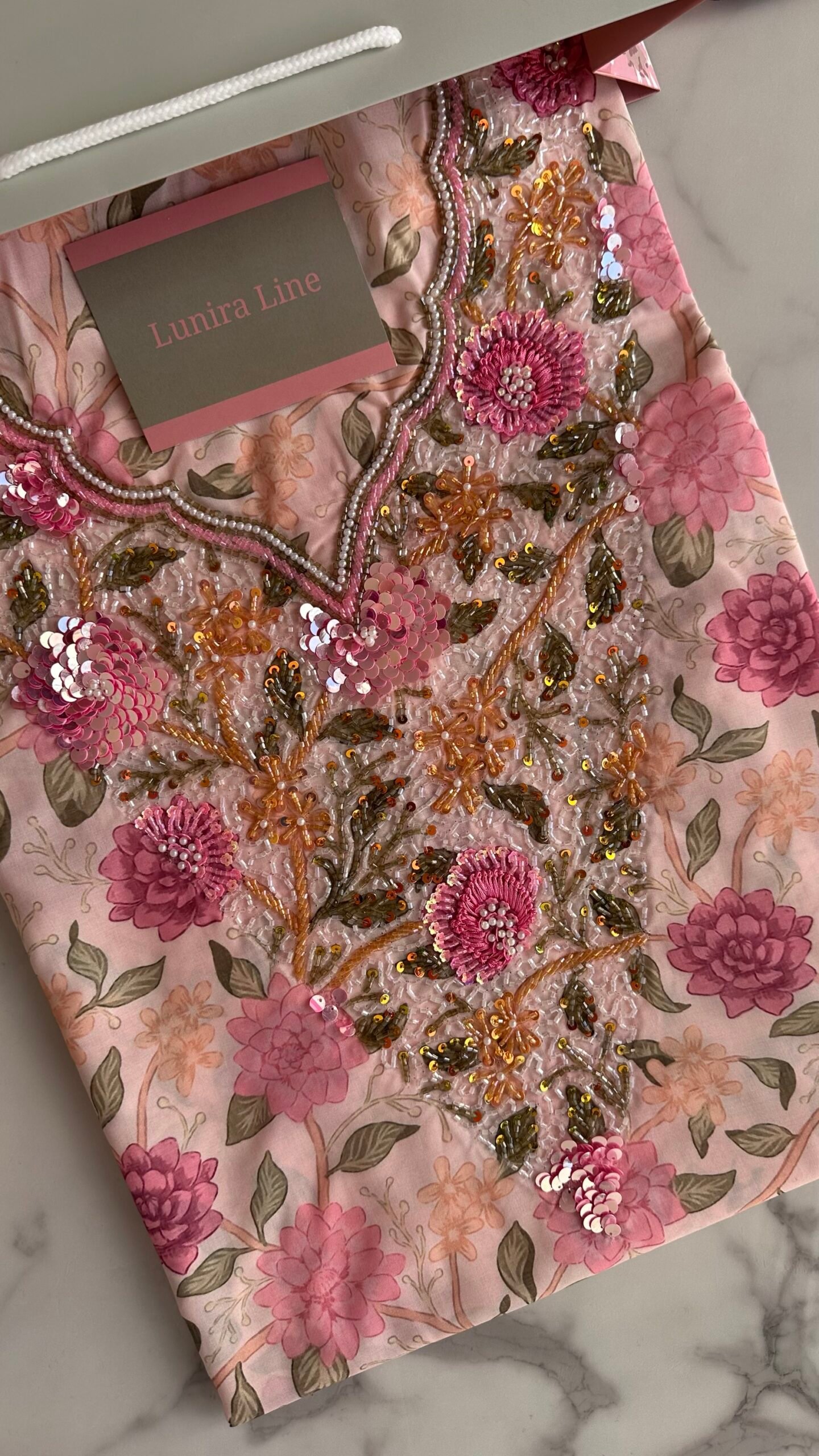 القماش قطن ليبرتي، الخوار خرز شك يدوي ولولو وفولك و خيوط نايلون بدقة عالية .طول القماش 4 وار. قياس الرقبة 8 انش طول في 7 انش عرض