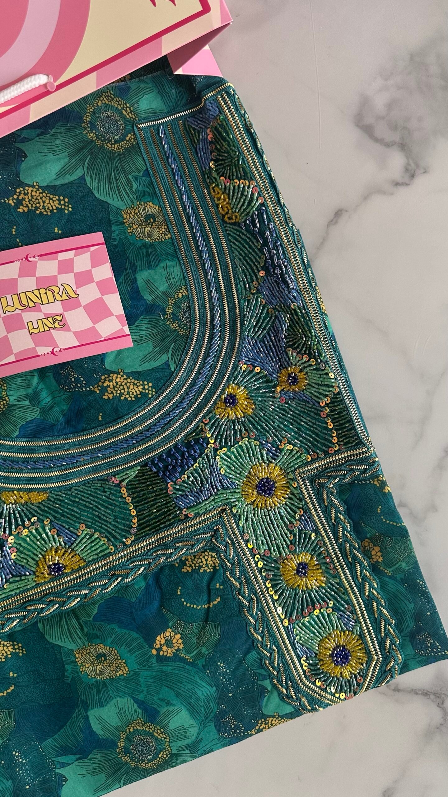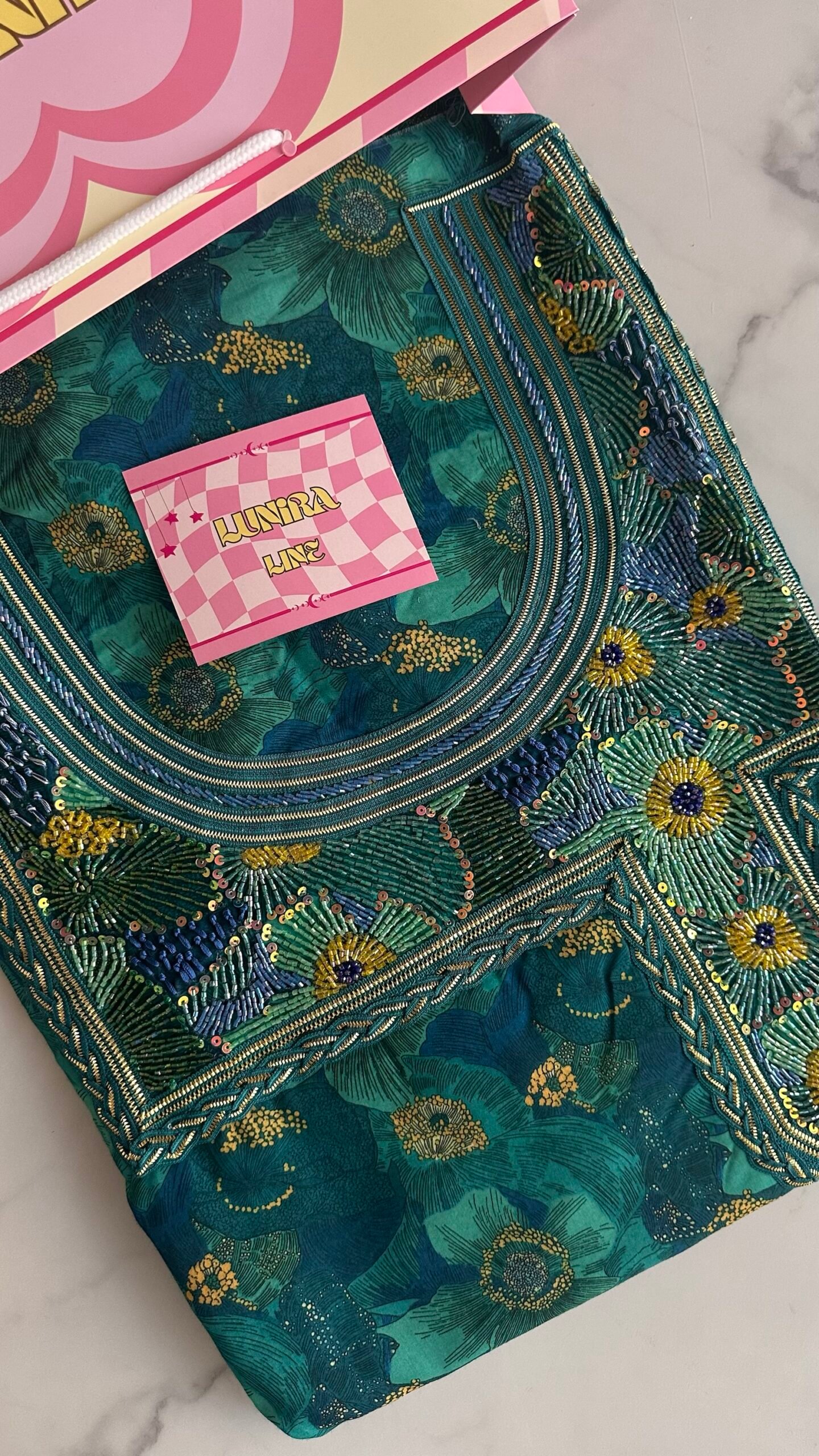 القماش قطن، الخوار خرز شك يدوي ولولو وفولك و خيوط نايلون بدقة عالية .طول القماش 4 وار. قياس الرقبة 8 انش طول في 7 انش عرض