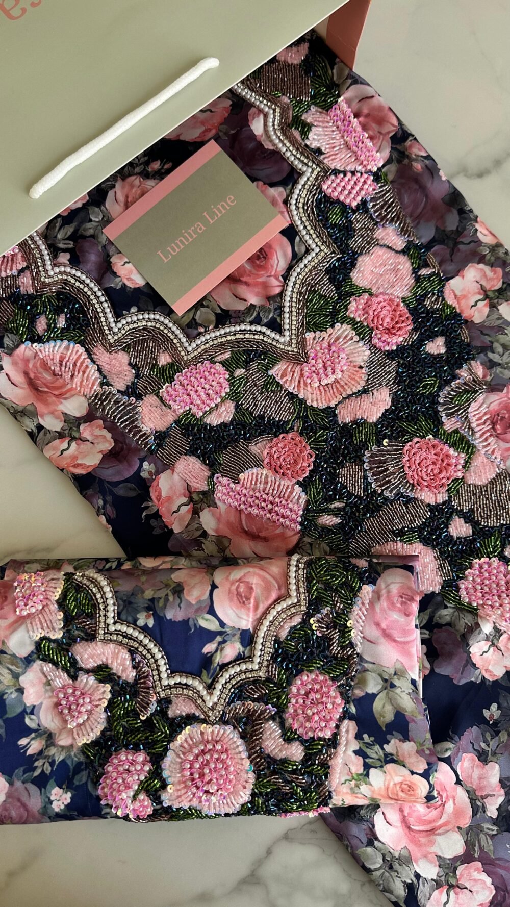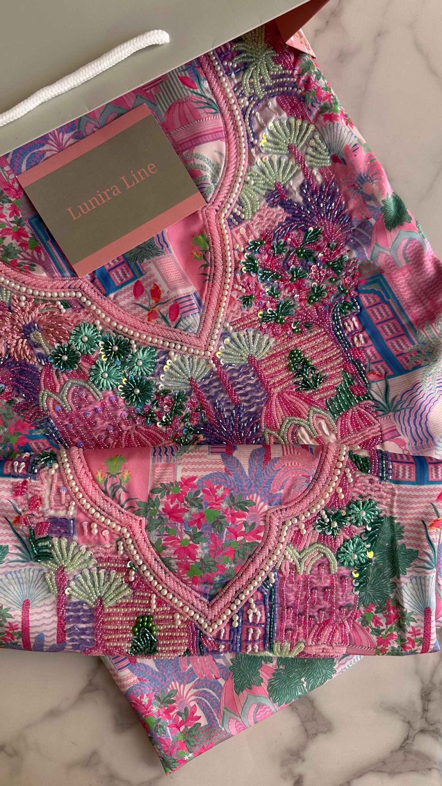القماش حرير إيطالي، الخوار خرز شك يدوي ولولو وفولك و خيوط نايلون بدقة عالية .طول القماش 3.5 وار، و طول العرض عرضين. قياس الرقبة 7.5 انش طول في 7 انش عرض