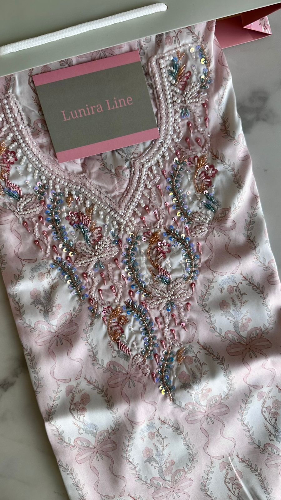 Hand wash or steam only to preserve the quality of the beading.