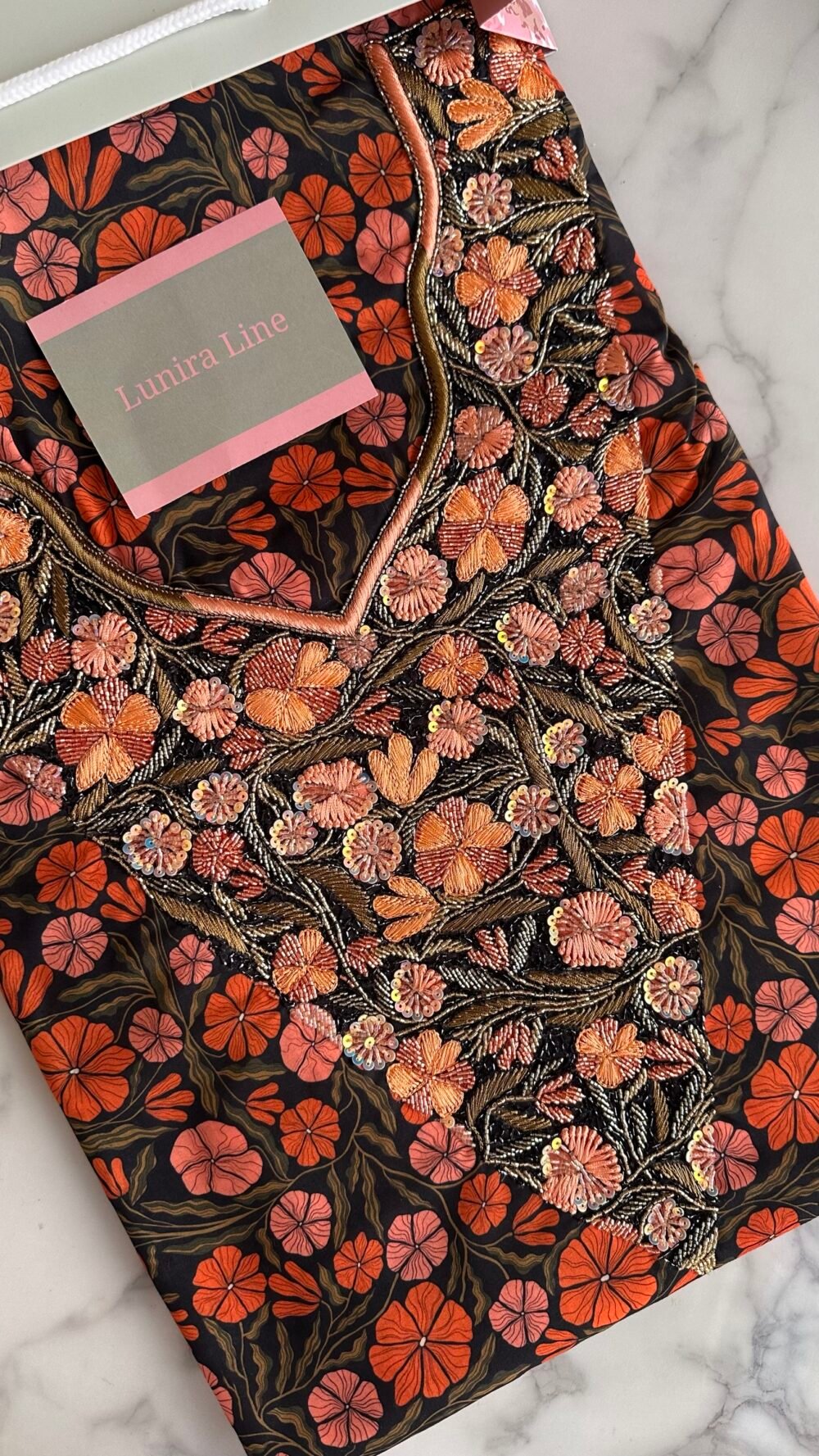 The fabric is cotton. The embroidery is hand-beaded with pearls, sequins, and nylon threads with high precision. Fabric length: 4 yards. Neckline measurement: 8 inches in length and 7 inches in width.