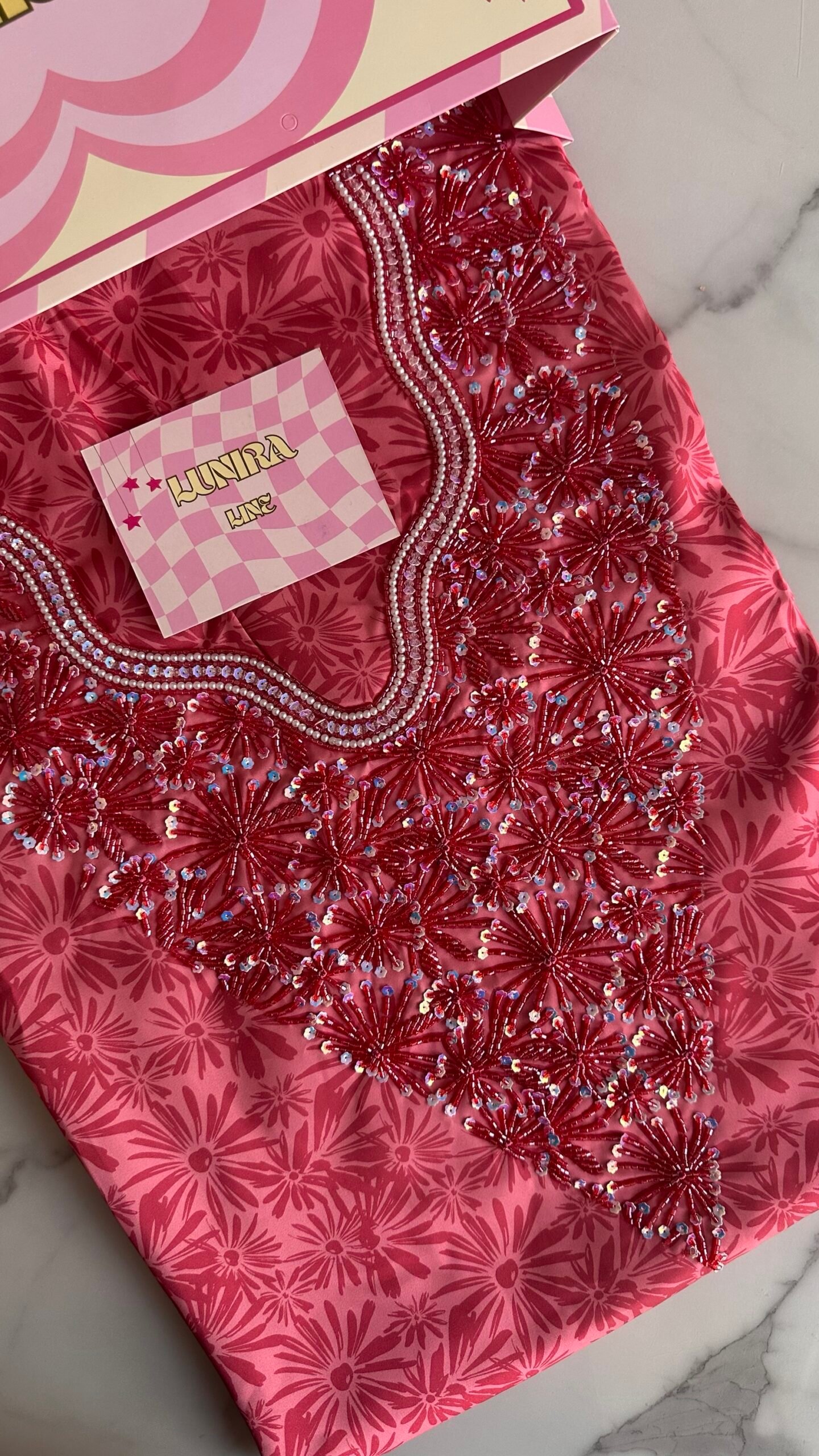 القماش حرير إيطالي، الخوار خرز شك يدوي ولولو وفولك و خيوط نايلون بدقة عالية .طول القماش 3.5 وار، و طول العرض عرضين. قياس الرقبة 7.6 انش طول في 7 انش عرض.